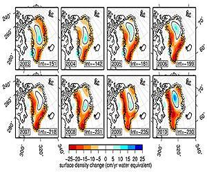 An enhanced approach to capturing changes on the Earth's surface via satellite could provide a more accurate account of how ice sheets, river basins and other geographic areas are changing as a result of natural and human factors. In a first application, the technique revealed sharper-than-ever details about Greenland's massive ice sheet, including that the rate at which it is melting might be accelerating more slowly than predicted. Princeton University researchers developed a mathematical framework and a computer code to accurately capture ground-level conditions collected on particular geographic regions by the GRACE satellites (Gravity Recovery And Climate Experiment), according to a report in the Proceedings of the National Academy of Sciences. A joint project of NASA and the German Aerospace Center, GRACE measures gravity to depict how mass such as ice or water is distributed over the Earth's surface. A change in GRACE data can signify a change in mass, such as a receding glacier. Typically, GRACE data are recorded for the whole globe and processed to remove large regional differences, said lead author Christopher Harig, a postdoctoral research associate in Princeton's Department of Geosciences. The result is a coarse image that can provide a general sense of mass change, but not details such as various mass fluctuations within an area. With their method, Harig and co-author Frederik Simons, an assistant professor of geosciences, can clean up data "noise" - the signal variations and distortions that can obscure satellite readings - and then recover the finer surface details hidden within. From this, they can configure regional information into a high-resolution map that depicts the specific areas where mass change is happening and to what degree. "We try to do very little processing to the data and stay closer to the real signal," Simons said. "GRACE data contain a lot of signals and a lot of noise. Our technique learns enough about the noise to effectively recover the signal, and at much finer spatial scales than was possible before. "We can 'see through' the noise and recover the 'true' geophysical information contained in these data. We can now revisit GRACE data related to areas such as river basins and irrigation and soil moisture, not just ice sheets." The researchers tested their method on GRACE data for Greenland recorded from 2003 to 2010 and brought the complexities of the island's glaciers into clearer focus. While overall ice loss on Greenland consistently increased between 2003 and 2010, Harig and Simons found that it was in fact very patchy from region to region. In addition, the enhanced detail of where and how much ice melted allowed the researchers to estimate that the annual acceleration in ice loss is much lower than previous research has suggested, roughly increasing by 8 billion tons every year. Previous estimates were as high as 30 billion tons more per year. Douglas MacAyeal, a geophysical sciences professor at the University of Chicago, said that the research provides a standardized and accurate method for translating GRACE data, particularly for ice sheets. The sprawling, incomplete nature of the satellite's information has spawned a myriad of approaches to interpreting it, some unique to specific scientists, he said. "GRACE data is notoriously noisy and spatially spread out, and this has resulted in 'ad hoc' methods for processing mass changes of Earth's ice sheets that have wildly different values," said MacAyeal, who is familiar with the Princeton work but had no role in it. "In other words, each particular investigator ends up getting a different individual number for the net change in mass," he said. "What this research does is figure out a way to be more thoughtful and purposeful about exactly how to deal with GRACE's notorieties. This method would allow researchers to standardize a bit more and also to understand more precisely where they are, and where they are not, able to resolve ice changes." Simons compared the noise that previously obscured a precise view of Greenland's glaciers to fog on a window. For a small area such as Greenland, the GRACE signal can be easily overwhelmed by noise, which has numerous causes such as the satellite's orbital position or even the type of mathematics researchers use to interpret data, Simons said. "Other researchers used less than perfect tools to wipe off the window more or less indiscriminately and quite literally left streaks on the data. They were thus less able to put the continent into the proper focus," he said. "We effectively modeled then removed noise to get the ice-loss signal out of the data," Simons said. "We then recovered relatively tiny variations in ice mass that to others might have looked like noise, but that to us were shown to be signal." The Princeton researchers found that Greenland lost roughly 200 billion tons of ice each year during the seven-year period studied, which falls within the range reported by other studies. The amount of ice lost annually could stack up on all of Manhattan to nearly 12,000 feet, or more than eight times taller than the Empire State Building, Harig said. As expected, ice loss occurred in the lower, warmer coastal areas - as opposed to the higher and colder interior, which gained ice mass - but the melt was concentrated on the southeast and northwest coasts for most of the period studied. Indeed, many coastal areas showed no ice-mass loss, while the ice sheet on the southwest coast actually thickened slightly from 2003 to 2006. But these trends were more complex when Harig and Simons got into the details. Surprisingly, the location of the greatest melt activity migrated around the island, shifting from the southeast to the northwest coast in just a few years. Ice loss on the southeast coast built up starting in 2003 and hit a highpoint in 2007. In 2008, loss on this coast began to recede and shift toward the northwest coast; by 2010, the southeast coast display