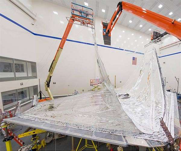 Byloff notes that in existing space systems the intermediate layer arises naturally, whereas in the Empa approach it is manufactured explicitly, allowing its properties to be tuned. The James Webb sunshield, measuring roughly 21 by 14 meters, highlights the mechanical demands on the composite: the stacked layers had to survive being tightly stowed for launch, deploy at the destination without tearing or delamination, and withstand impacts from particles and space debris without cracks spreading across large areas.