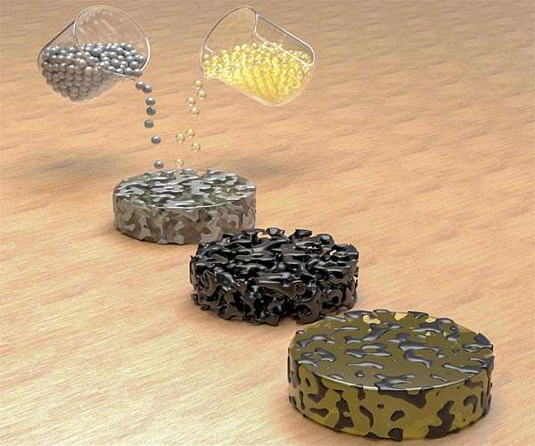 Rice University scientists have built a better epoxy for electronic applications. Epoxy combined with "ultrastiff" graphene foam invented in the Rice lab of chemist James Tour is substantially tougher than pure epoxy and far more conductive than other epoxy composites while retaining the material's low density. It could improve upon epoxies in current use that weaken the material's structure with the addition of conductive fillers. The new material is detailed in the American Chemical Society journal ACS Nano. By itself, epoxy is an insulator, and is commonly used in coatings, adhesives, electronics, industrial tooling and structural composites. Metal or carbon fillers are often added for applications where conductivity is desired, like electromagnetic shielding. But there's a trade-off: More filler brings better conductivity at the cost of weight and compressive strength, and the composite becomes harder to process. The Rice solution replaces metal or carbon powders with a three-dimensional foam made of nanoscale sheets of graphene, the atom-thick form of carbon. The Tour lab, in collaboration with Rice materials scientists Pulickel Ajayan, Rouzbeh Shahsavari and Jun Lou and Yan Zhao of Beihang University in Beijing, took their inspiration from projects to inject epoxy into 3D scaffolds including graphene aerogels, foams and skeletons from various processes. The new scheme makes much stronger scaffolds from polyacrylonitrile (PAN), a powdered polymer resin they use as a source of carbon, mixed with nickel powder. In the four-step process, they cold-press the materials to make them dense, heat them in a furnace to turn the PAN into graphene, chemically treat the resulting material to remove the nickel and use a vacuum to pull the epoxy into the now-porous material. "The graphene foam is a single piece of few-layer graphene," Tour said. "Therefore, in reality, the entire foam is one large molecule. When the epoxy infiltrates the foam and then hardens, any bending in the epoxy in one place will stress the monolith at many other locations due to the embedded graphene scaffolding. This ultimately stiffens the entire structure." The puck-shaped composites with 32 percent foam were marginally denser, but had an electrical conductivity of about 14 Siemens (a measure of conductivity, or inverse ohms) per centimeter, according to the researchers. The foam did not add significant weight to the compound, but gave it seven times the compressive strength of pure epoxy. Easy interlocking between the graphene and epoxy helped stabilize the structure of the graphene as well. "When the epoxy infiltrates the graphene foam and then hardens, the epoxy is captured in micron-sized domains of the graphene foam," Tour said. The lab upped the ante by mixing multiwalled carbon nanotubes into the graphene foam. The nanotubes acted as reinforcement bars that bonded with the graphene and made the composite 1,732 percent stiffer than pure epoxy and nearly three times as conductive, at about 41 Siemens per centimeter, far greater than nearly all of the scaffold-based epoxy composites reported to date, according to the researchers. Tour expects the process will scale for industry. "One just needs a furnace large enough to produce the ultimate part," he said. "But that is done all the time to make large metal parts by cold-pressing and then heating them." He said the material could initially replace the carbon-composite resins used to pre-impregnate and reinforce fabric used in materials from aerospace structures to tennis rackets.