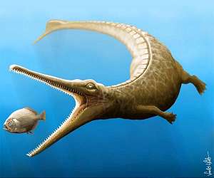 Jurassic fossil tail tells of missing link in crocodile family tree Edinburgh UK (SPX) May 14, 2018 A 180 million-year-old fossil has shed light on how some ancient crocodiles evolved into dolphin-like animals. The specimen - featuring a large portion of backbone - represents a missing link in the family tree of crocodiles, and was one of the largest coastal predators of the Jurassic Period, researchers say. The newly discovered species was nearly five metres long and had large, pointed teeth for grasping prey. It also shared key body features seen in two distinct families of prehistoric c ... read more