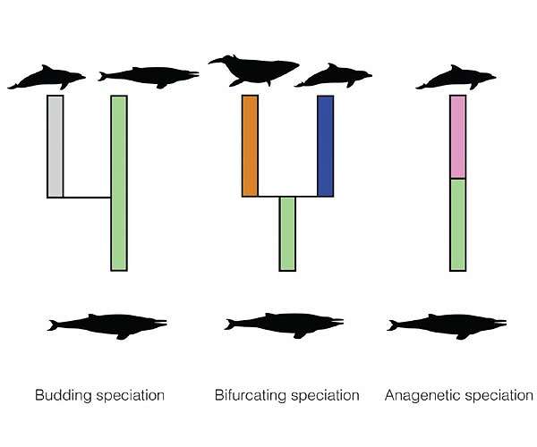 Insights into speciation The new model now incorporates them, thus ensuring that fossil-based and phylogenetic information produce compatible speciation and extinction rates. It also provides indications as to which speciation mechanism predominated in a particular animal or plant group. For example, the evolutionary tree and the fossil record of whales reveals that the most frequent mode may be anagenesis; that is, original species are gradually transformed into new ones (mode 3; see box). In consequence, the model could be used in future studies to gain new insights into the evolution of organisms. It also helps to harmonise the results of fossil based and phylogenetic analysis better than before.