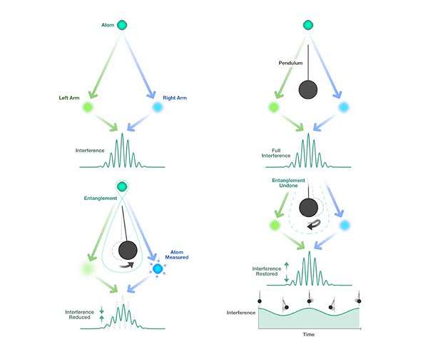 When it comes to a marriage with quantum theory, gravity is the lone holdout among the four fundamental forces in nature. The three others-the electromagnetic force, the weak force, which is responsible for radioactive decay, and the strong force, which binds neutrons and protons together within the atomic nucleus-have all merged with quantum theory to successfully describe the universe on the tiniest of scales, where the laws of quantum mechanics must play a leading role. Although Einstein's theory of general relativity, which describes gravity as a curvature of space-time, explains a multitude of gravitational phenomena, it fails within the tiniest of volumes-the center of a black hole or the universe at its explosive birth, when it was less than an atomic diameter in size. That's where quantum mechanics ought to dominate. Yet over the past eight decades, expert after expert, including Einstein, have been unable to unite quantum theory with gravity. So, is gravity truly a quantum force? Researchers at the National Institute of Standards and Technology (NIST) and their colleagues have now proposed an experiment that may help settle the question. The experiment takes advantage of two of the weirdest properties of quantum theory. One is the superposition principle, which holds that an undisturbed atomic particle can be described as a wave, with some probability of being in two places at once. For instance, an undisturbed atom traveling through a region with two slits, passes through not one or the other of the slits but both. And because the atom is described by a wave, the portion that passes through one slit will interfere with the part that passes through the other, producing a well-known pattern of bright and dark fringes. The bright fringes correspond to regions where the hills and valleys of the two waves align so that they add together, creating constructive interference and the dark regions correspond to regions where the hills and valleys of the waves cancel each out, creating destructive interference. The second strange quantum property is known as entanglement, a phenomenon in which two particles can be so strongly correlated that they behave as a single entity. Measuring a property of one of the particles automatically forces the other to have a complementary property, even if the two particles reside galaxies apart. In a quantum theory of gravity, the gravitational attraction between two massive objects would be communicated by a hypothetical subatomic particle, the graviton, in the same way that the electromagnetic interaction between two charged particles is communicated by a photon (the fundamental particle of light). So, if a graviton truly exists, it should be able to connect, or entangle, the properties of two massive bodies, just as a photon can entangle the properties of two charged particles The proposed experiment by Jake Taylor of NIST's Joint Quantum Institute at the University of Maryland, along with Daniel Carney, now at the Lawrence Berkeley National Laboratory, and Holger Muller of the University of California, Berkeley, provides a clever way to test if two massive bodies can indeed become entangled by gravity. They described their work in an article published online in Physical Review X Quantum on August 18, 2021. The experiment would use a cold cloud of atoms, trapped inside an atomic interferometer. The interferometer has two arms-a left arm and a right. According to the superposition principle, if each atom in the cloud is in a pure, undisturbed quantum state, it can be described as a wave occupying both arms simultaneously. When the two portions of the wave, one from each arm, recombine, they will produce an interference pattern that reveals any changes to their paths due to forces like gravity. A small, initially stationary mass suspended as a pendulum is introduced just outside the interferometer. The suspended mass and the atom are gravitationally attracted. If that gravitational tug also produces entanglement, what would that look like? The suspended mass will become correlated with a specific location for the atom-either the right arm of the interferometer or the left. As a result, the mass will start swinging to the left or the right. If the atom is located on the left, the pendulum will start swinging to the left; if the atom is located on the right, the pendulum will start swinging to the right. Gravity has entangled the position of the atom in the interferometer with the direction in which the pendulum begins swinging. The position entanglement means that the pendulum has effectively measured the location of the atom, pinpointing it to a particular site within the interferometer. Because the atom is no longer in a superposition of being in both arms at the same time, the interference pattern vanishes or diminishes. Half a period later, when the swinging mass returns to its starting point, it loses all "memory" of the gravitational entanglement it had created. That's because regardless of what path the pendulum took - initially swinging to the right, which picks out a location for the atom in the right interferometer arm, or initially swinging to the left, which picks out a location for the atom in the left arm - it returns to the same starting position, much like a child on a swing. And when it returns to the starting position, it's equally likely that the pendulum will pick out a location for the atom in the left or right arm. At that moment, entanglement between the mass and the atom has been erased and the atomic interference pattern reappears. Half a period after that, as the pendulum swings to one side or the other, entanglement is re-established and the interference pattern diminishes once again. As the pendulum swings back and forth the pattern repeats-interference, diminished interference, interference. This collapse and revival of interference, the scientists say, would be a "smoking gun" for entanglement. "It is difficult for any phenom