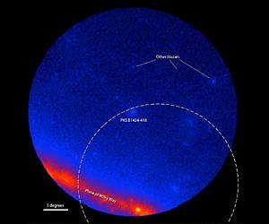 Nearly 10 billion years ago, the black hole at the center of a galaxy known as PKS B1424-418 produced a powerful outburst. Light from this blast began arriving at Earth in 2012. Now astronomers using data from NASA's Fermi Gamma-ray Space Telescope and other space- and ground-based observatories have shown that a record-breaking neutrino seen around the same time likely was born in the same event. "Neutrinos are the fastest, lightest, most unsociable and least understood fundamental particles, and we are just now capable of detecting high-energy ones arriving from beyond our galaxy," said Roopesh Ojha, a Fermi team member at NASA's Goddard Space Flight Center in Greenbelt, Maryland, and a coauthor of the study. "Our work provides the first plausible association between a single extragalactic object and one of these cosmic neutrinos." Although neutrinos far outnumber all the atoms in the universe, they rarely interact with matter, which makes detecting them quite a challenge. But this same property lets neutrinos make a fast exit from places where light cannot easily escape - such as the core of a collapsing star - and zip across the universe almost completely unimpeded. Neutrinos can provide information about processes and environments that simply aren't available through a study of light alone. The IceCube Neutrino Observatory, built into a cubic kilometer of clear glacial ice at the South Pole, detects neutrinos when they interact with atoms in the ice. This triggers a cascade of fast-moving charged particles that emit a faint glow, called Cerenkov light, as they travel, which is picked up by thousands of optical sensors strung throughout IceCube. Scientists determine the energy of an incoming neutrino by the amount of light its particle cascade emits. To date, the IceCube science team has detected about a hundred very high-energy neutrinos and nicknamed some of the most extreme events after characters on the children's TV series "Sesame Street." On Dec. 4, 2012, IceCube detected an event known as Big Bird, a neutrino with an energy exceeding 2 quadrillion electron volts (PeV). To put that in perspective, it's more than a million million times greater than the energy of a dental X-ray packed into a single particle thought to possess less than a millionth the mass of an electron. Big Bird was the highest-energy neutrino ever detected at the time and still ranks second. Where did it come from? The best IceCube position only narrowed the source to a patch of the southern sky about 32 degrees across, equivalent to the apparent size of 64 full moons. Enter Fermi. Starting in the summer of 2012, the satellite's Large Area Telescope (LAT) witnessed a dramatic brightening of PKS B1424-418, an active galaxy classified as a gamma-ray blazar. An active galaxy is an otherwise typical galaxy with a compact and unusually bright core. The excess luminosity of the central region is produced by matter falling toward a supermassive black hole weighing millions of times the mass of our sun. As it approaches the black hole, some of the material becomes channeled into particle jets moving outward in opposite directions at nearly the speed of light. In blazars, one of these jets happens to point almost directly toward Earth. During the year-long outburst, PKS B1424-418 shone between 15 and 30 times brighter in gamma rays than its average before the eruption. The blazar is located within the Big Bird source region, but then so are many other active galaxies detected by Fermi. The scientists searching for the neutrino source then turned to data from a long-term observing program named TANAMI. Since 2007, TANAMI has routinely monitored nearly 100 active galaxies in the southern sky, including many flaring sources detected by Fermi. The program includes regular radio observations using the Australian Long Baseline Array (LBA) and associated telescopes in Chile, South Africa, New Zealand and Antarctica. When networked together, they operate as a single radio telescope more than 6,000 miles across and provide a unique high-resolution look into the jets of active galaxies. Three radio observations of PKS B1424-418 between 2011 and 2013 cover the period of the Fermi outburst. They reveal that the core of the galaxy's jet had brightened by about four times. No other galaxy observed by TANAMI over the life of the program has exhibited such a dramatic change. "We combed through the field where Big Bird must have originated looking for astrophysical objects capable of producing high-energy particles and light," said coauthor Felicia Krauss, a doctoral student at the University of Erlangen-Nuremberg in Germany. "There was a moment of wonder and awe when we realized that the most dramatic outburst we had ever seen in a blazar happened in just the right place at just the right time." In a paper published Monday, April 18, in Nature Physics, the team suggests the PKS B1424-418 outburst and Big Bird are linked, calculating only a 5-percent probability the two events occurred by chance alone. Using data from Fermi, NASA's Swift and WISE satellites, the LBA and other facilities, the researchers determined how the energy of the eruption was distributed across the electromagnetic spectrum and showed that it was sufficiently powerful to produce a neutrino at PeV energies. "Taking into account all of the observations, the blazar seems to have had means, motive and opportunity to fire off the Big Bird neutrino, which makes it our prime suspect," said lead author Matthias Kadler, a professor of astrophysics at the University of Wuerzburg in Germany. Francis Halzen, the principal investigator of IceCube at the University of Wisconsin-Madison, and not involved in this study, thinks the result is an exciting hint of things to come. "IceCube is about to send out real-time alerts when it records a neutrino that can be localized to an area a little more than half a degree across, or slightly larger than the apparent size of a full moon,"