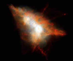 An international team of researchers using the Atacama Large Millimeter/submillimeter Array (ALMA) and other telescopes has discovered the power source illuminating a so-called Lyman-alpha Blob - a rare, brightly glowing, and enormous concentration of gas in the distant universe. Until now, astronomers wondered why these huge clouds of gas shined so brightly. The answer, in this example at least, appears to be two galaxies at the heart of the blob undergoing furious star formation and lighting up their surroundings. These large galaxies, which are destined to eventually merge into a single elliptical galaxy, are in the midst of a swarm of smaller galaxies. This appears to be an early phase in the formation of a massive cluster of galaxies. Lyman-alpha blobs (LABs) are gigantic clouds of hydrogen gas that can span hundreds of thousands of light-years and are found at very large cosmic distances. The name reflects the characteristic wavelength of ultraviolet light that they emit, known as Lyman-alpha radiation. Since their discovery, the processes that give rise to LABs have been an astronomical puzzle. New observations with ALMA have now cleared up the mystery. One of the largest Lyman-alpha blobs known, and the most thoroughly studied, is SSA22-Lyman-alpha Blob 1, or LAB-1. Embedded in the core of a huge cluster of galaxies in the early stages of formation, it was the very first such object to be discovered - in 2000 - and is located so far away that its light has taken about 11.5 billion years to reach us. A team of astronomers, led by Jim Geach, from the Center for Astrophysics Research of the University of Hertfordshire, UK, has now used ALMA's unparalleled ability to observe light from cool dust clouds in distant galaxies to peer deeply into LAB-1. This allowed them to pinpoint and resolve several sources of submillimeter emission. The astronomers then combined the ALMA images with observations from the Multi Unit Spectroscopic Explorer (MUSE) instrument mounted on ESO's Very Large Telescope (VLT), which map the Lyman-alpha light. This showed that the ALMA sources are located in the very heart of the Lyman-alpha Blob, where they are forming stars at a rate over 100 times that of the Milky Way. Deep imaging with the NASA/ESA Hubble Space Telescope and spectroscopy at the W. M. Keck Observatory also revealed that the ALMA sources are surrounded by numerous faint companion galaxies that could be bombarding the central ALMA sources with material, helping to drive their high star formation rates. The team then turned to a sophisticated simulation of galaxy formation, known as the Feedback in Realistic Environments (FIRE), to demonstrate that the giant glowing cloud of Lyman-alpha emission can be explained if ultraviolet light produced by star formation in the ALMA sources scatters off the surrounding hydrogen gas. This would give rise to the Lyman-alpha Blob we see. Jim Geach, lead author of the new study accepted for publication in the Astrophysical Journal, explains: "Think of a streetlight on a foggy night - you see the diffuse glow because light is scattering off the tiny water droplets. A similar thing is happening here, except the streetlight is an intensely star-forming galaxy and the fog is a huge cloud of intergalactic gas. The galaxies are illuminating their surroundings." Understanding how galaxies form and evolve is a massive challenge. Astronomers think Lyman-alpha blobs are important because they seem to be the places where the most massive galaxies in the universe form. In particular, the extended Lyman-alpha glow provides information on what is happening in the primordial gas clouds surrounding young galaxies, a region that is very difficult to study, but critical to understand. "Unveiling the galaxies shrouded in LAB-1 did more than just put to bed the longstanding issue of the gas cloud's glow," said Desika Narayanan of Haverford College in Pennsylvania and coauthor of the paper. "It provided a rare opportunity to see how young, growing galaxies behaved when the universe was quite young." Jim Geach concludes, "What's exciting about these blobs is that we are getting a rare glimpse of what's happening around these young, growing galaxies. For a long time, the origin of the extended Lyman-alpha light has been controversial. But with the combination of new observations and cutting-edge simulations, we think we have solved a 15-year-old mystery: Lyman-alpha Blob-1 is the site of formation of a massive elliptical galaxy that will one day be the heart of a giant cluster. We are seeing a snapshot of the assembly of that galaxy 11.5 billion years ago." Research paper: "ALMA Observations of Lyman-alpha Blob 1: Halo Substructure Illuminated from Within," J. Geach et al., 2016, Astrophysical Journal