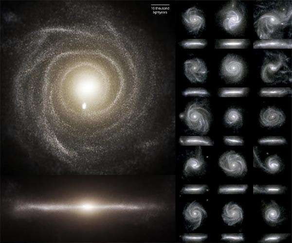 Scientists from Germany and the United States have unveiled the results of a newly-completed, state of the art simulation of the evolution of galaxies. TNG50 is the most detailed large-scale cosmological simulation yet. It allows researchers to study in detail how galaxies form, and how they have evolved since shortly after the Big Bang. For the first time, it reveals that the geometry of the cosmic gas flows around galaxies determines galaxies' structures, and vice versa. The researchers publish their results in two papers in the journal Monthly Notices of the Royal Astronomical Society. Astronomers running cosmological simulations face a fundamental trade-off: with finite computing power, typical simulations so far have been either very detailed or have spanned a large volume of virtual space, but have so far not been able to do both. Detailed simulations with limited volumes can model no more than a few galaxies, making statistical deductions difficult. Large-volume simulations, in turn, typically lack the details necessary to reproduce many of the small-scale properties we observe in our own Universe, reducing their predictive power. The TNG50 simulation, which has just been published, manages to avoid this trade-off. For the first time, it combines the idea of a large-scale cosmological simulation - a Universe in a box - with the computational resolution of "zoom" simulations, at a level of detail that had previously only been possible for studies of individual galaxies. In a simulated cube of space that is more than 230 million light-years across, TNG50 can discern physical phenomena that occur on scales one million times smaller, tracing the simultaneous evolution of thousands of galaxies over 13.8 billion years of cosmic history. It does so with more than 20 billion particles representing dark (invisible) matter, stars, cosmic gas, magnetic fields, and supermassive black holes. The calculation itself required 16,000 cores on the Hazel Hen supercomputer in Stuttgart, working together, 24/7, for more than a year - the equivalent of fifteen thousand years on a single processor, making it one of the most demanding astrophysical computations to date. The first scientific results from TNG50 are published by a team led by Dr Annalisa Pillepich (Max Planck Institute for Astronomy, Heidelberg) and Dr Dylan Nelson (Max Planck Institute for Astrophysics, Garching) and reveal unforeseen physical phenomena. According to Nelson: "Numerical experiments of this kind are particularly successful when you get out more than you put in. In our simulation, we see phenomena that had not been programmed explicitly into the simulation code. These phenomena emerge in a natural fashion, from the complex interplay of the basic physical ingredients of our model universe." TNG50 features two prominent examples for this kind of emergent behaviour. The first concerns the formation of "disc" galaxies like our own Milky Way. Using the simulation as a time machine to rewind the evolution of cosmic structure, researchers have seen how the well-ordered, rapidly rotating disc galaxies (which are common in our nearby Universe) emerge from chaotic, disorganised, and highly turbulent clouds of gas at earlier epochs. As the gas settles down, newborn stars are typically found on more and more circular orbits, eventually forming large spiral galaxies - galactic carousels. Annalisa Pillepich explains: "In practice, TNG50 shows that our own Milky Way galaxy with its thin disc is at the height of galaxy fashion: over the past 10 billion years, at least those galaxies that are still forming new stars have become more and more disc-like, and their chaotic internal motions have decreased considerably. The Universe was much messier when it was just a few billion years old!" As these galaxies flatten out, researchers found another emergent phenomenon, involving the high-speed outflows and winds of gas flowing out of galaxies. This launched as a result of the explosions of massive stars (supernovae) and activity from supermassive black holes found at the heart of galaxies. Galactic gaseous outflows are initially also chaotic and flow away in all directions, but over time, they begin to become more focused along a path of least resistance. In the late universe, flows out of galaxies take the form of two cones, emerging in opposite directions - like two ice cream cones placed tip to tip, with the galaxy swirling at the centre. These flows of material slow down as they attempt to leave the gravitational well of the galaxy's halo of invisible - or dark - matter, and can eventually stall and fall back, forming a galactic fountain of recycled gas. This process redistributes gas from the centre of a galaxy to its outskirts, further accelerating the transformation of the galaxy itself into a thin disc: galactic structure shapes galactic fountains, and vice versa. The team of scientists creating TNG50 (based at Max-Planck-Institutes in Garching and Heidelberg, Harvard University, MIT, and the Center for Computational Astrophysics (CCA)) will eventually release all simulation data to the astronomy community at large, as well as to the public. This will allow astronomers all over the world to make their own discoveries in the TNG50 universe - and possibly find additional examples of emergent cosmic phenomena, of order emerging from chaos.