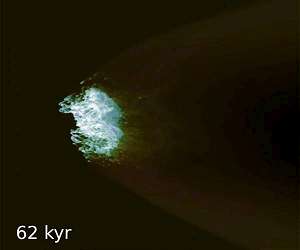 Simulating cold clouds The galaxy produces new stars about five times faster than our own galaxy's rate of star production. This star-making frenzy gives rise to galactic wind that pushes out more gas than the system keeps in, leading astronomers to estimate that M82 will run out of fuel in just 8 million years. Analyzing images from NASA's Hubble Space Telescope, scientists can observe this slow-developing exodus of gas and dust. Data gathered from such observations can help Robertson and Schneider gauge if they are on the right track when simulating galactic wind. "With galaxies like M82, you see a lot of cold material at large radius that's flowing out very fast. We wanted to see, if you took a realistic cloud of cold gas and hit it with a hot, fast-flowing, supernova-driven outflow, if you could accelerate that cold material to velocities like what are observed," Robertson said. Answering this question in high resolution required an efficient code that could solve the problem based on well-known physics, such as the motion of liquids. Robertson and Schneider developed Cholla to carry out hydrodynamics calculations entirely on GPUs, highly parallelized accelerators that excel at simple number crunching, thus achieving high-resolution results. In Titan, a 27-petaflop system containing more than 18,000 GPUs, Cholla found its match. After testing the code on a GPU cluster at the University of Arizona, Robertson and Schneider benchmarked Cholla under two small OLCF Director's Discretionary awards before letting the code loose under INCITE. In test runs, the code has maintained scaling across more than 16,000 GPUs. "We can use all of Titan," Robertson said, "which is kind of amazing because the vast majority of the power of that system is in GPUs." The pairing of code and computer gave Robertson and Schneider the tools needed to produce high-fidelity simulations of gas clouds measuring more than 15 light years in diameter. Furthermore, the team can zoom in on parts of the simulation to study phases and properties of galactic wind in isolation. This capability helped the team to rule out a theory that posited cold clouds close to the galaxy's center could be pushed out by fast-moving, hot wind from supernovas. "The answer is it isn't possible," Robertson said. "The hot wind actually shreds the clouds and the clouds become sheared and very narrow. They're like little ribbons that are very difficult to push on."