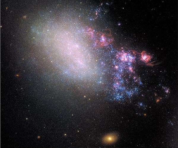 The irregular galaxy NGC 4485 shows all the signs of having been involved in a hit-and-run accident with a bypassing galaxy. Rather than destroying the galaxy, the chance encounter is spawning a new generation of stars, and presumably planets. The right side of the galaxy is ablaze with star formation, shown in the plethora of young blue stars and star-incubating pinkish nebulas. The left side, however, looks intact. It contains hints of the galaxy's previous spiral structure, which, at one time, was undergoing normal galactic evolution. The larger culprit galaxy, NGC 4490, is off the bottom of the frame. The two galaxies sideswiped each other millions of years ago and are now 24,000 light-years apart. The gravitational tug-of-war between them created rippling patches of higher-density gas and dust within both galaxies. This activity triggered a flurry of star formation. This galaxy is a nearby example of the kind of cosmic bumper-car activity that was more common billions of years ago when the universe was smaller and galaxies were closer together. NGC 4485 lies 25 million light-years away in the northern constellation Canes Venatici (the Hunting Dogs). This new image, captured by Hubble's Wide Field Camera 3 (WFC3) and Advanced Camera for Surveys (ACS), provides further insight into the complexities of galaxy evolution.