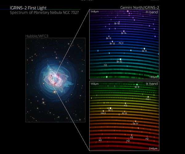 IGRINS-2 (Immersion GRating INfrared Spectrograph-2) has set its 'eyes' on the sky for the first time. Mounted on the Gemini North telescope, one half of the International Gemini Observatory operated by NSF's NOIRLab, the new instrument obtained spectra of the planetary nebula NGC 7027, nicknamed the Jewel Bug Nebula. NGC 7027 is one of the visually brightest planetary nebulae, and its resplendent rosette - made of layers of gas ejected during the dying breaths of its central star - makes for an exciting first light target.