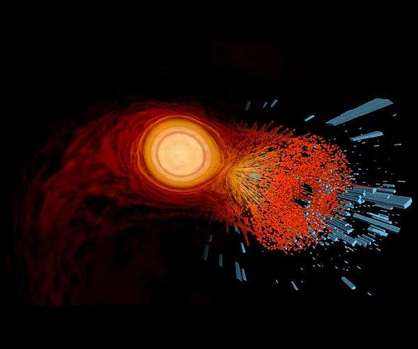 Neutron stars are among the densest objects in the universe. If our Sun, with its radius of 700,000 kilometres were a neutron star, its mass would be condensed into an almost perfect sphere with a radius of around 12 kilometres. When two neutron stars collide and merge into a hyper-massive neutron star, the matter in the core of the new object becomes incredibly hot and dense. According to physical calculations, these conditions could result in hadrons such as neutrons and protons, which are the particles normally found in our daily experience, dissolving into their components of quarks and gluons and thus producing a quark-gluon plasma. In 2017 it was discovered for the first time that merging neutron stars send out a gravitational wave signal that can be detected on Earth. The signal not only provides information on the nature of gravity, but also on the behaviour of matter under extreme conditions. When these gravitational waves were first discovered in 2017, however, they were not recorded beyond the merging point. This is where the work of the Frankfurt physicists begins. They simulated merging neutron stars and the product of the merger to explore the conditions under which a transition from hadrons to a quark-gluon plasma would take place and how this would affect the corresponding gravitational wave. The result: in a specific, late phase of the life of the merged object a phase transition to the quark-gluon plasma took place and left a clear and characteristic signature on the gravitational-wave signal. Professor Luciano Rezzolla from Goethe University is convinced: "Compared to previous simulations, we have discovered a new signature in the gravitational waves that is significantly clearer to detect. If this signature occurs in the gravitational waves that we will receive from future neutron-star mergers, we would have a clear evidence for the creation of quark-gluon plasma in the present universe."