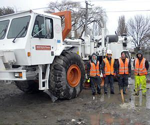 Researchers from the University of Texas at Austin's Cockrell School of Engineering are developing ground-improvement methods to help increase the resilience of homes and low-rise structures built on top of soils prone to liquefaction during strong earthquakes. Findings will help improve the safety of structures in Christchurch and the Canterbury region in New Zealand, which were devastated in 2010 and 2011 by a series of powerful earthquakes. Parts of Christchurch were severely affected by liquefaction, in which water-saturated soil temporarily becomes liquid-like and often flows to the surface creating sand boils. "The 2010-2011 Canterbury earthquakes in New Zealand have caused significant damage to many residential houses due to varying degrees of soil liquefaction over a wide extent of urban areas unseen in past destructive earthquakes," said Kenneth Stokoe, a professor in the Department of Civil, Architectural and Environmental Engineering. "One critical problem facing the rebuilding effort is that the land remains at risk of liquefaction in future earthquakes. Therefore, effective engineering solutions must be developed to increase the resilience of homes and low-rise structures." Researchers have conducted a series of field trials to test shallow-ground-improvement methods. "The purpose of the field trials was to determine if and which improvement methods achieve the objectives of inhibiting liquefaction triggering in the improved ground and are cost-effective measures," said Stokoe, working with Brady Cox, an assistant professor of civil engineering. "This knowledge is needed to develop foundation design solutions." Findings were detailed in a research paper presented in December at the New Zealand - Japan Workshop on Soil Liquefaction during Recent large-Scale Earthquakes. The paper was authored by Stokoe, graduate students Julia Roberts and Sungmoon Hwang; Cox and operations manager Farn-Yuh Menq from the University of Texas at Austin; and Sjoerd Van Ballegooy from Tonkin and Taylor Ltd, an international environmental and engineering consulting firm in Auckland, New Zealand. The researchers collected data from test sections of improved and unimproved soils that were subjected to earthquake stresses using a large mobile shaker, called T-Rex, and with explosive charges planted underground. The test sections were equipped with sensors to monitor key factors including ground motion and water pressure generated in soil pores during the induced shaking, providing preliminary data to determine the most effective ground-improvement method. Four ground-improvement methods were initially selected for the testing: rapid impact compaction (RIC); rammed aggregate piers (RAP), which consist of gravel columns; low-mobility grouting (LMG); and construction of a single row of horizontal beams (SRB) or a double row of horizontal beams (DRB) beneath existing residential structures via soil-cement mixing. "The results are being analyzed, but good and poor performance can already be differentiated," Stokoe said. "The ground-improvement methods that inhibited liquefaction triggering the most were RIC, RAP, and DRB. However, additional analyses are still underway." The test site is located along the Avon River in the Christchurch suburb of Bexley. The work is part of a larger testing program that began in early 2013 with a preliminary evaluation by Brady Cox of seven potential test sites along the Avon River in the Christchurch area. The 64,000-pound T-Rex, operated by NEES@UTexas at UT Austin, is used to simulate a wide range of earthquake shaking levels. NEES is a shared network of 14 experimental facilities, collaborative tools, centralized data repository and earthquake simulation software, all linked by high-speed Internet connections.