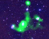 Calgary, Alberta (SPX) Jun 7, 2006 Astronomers have detected substantial amounts of filamentary cold gas in compact groups of galaxies, highlighting what may be an important force in galactic evolution. The findings also raise the possibility that more matter than previously thought might be tied up in these galaxy groups, captured in the lattice of the cosmic web. The research was presented at the 208th meeting of the American Astronomical Association by Sanchayeeta Borthakur of the University of Massachusetts at Amherst. Lourdes Verdes-Montenegro, of Instituto de Astrofisica de Andalucia in Spain, also collaborated. Most spiral galaxies, such as the Milky Way, are brimming with cold gas that fuels the creation of stars. These relatively young galaxies shine with bluish light and are scattered throughout the universe, often in little groups. Elliptical galaxies, on the other hand, tend to shine red and live a crammed existence with thousands like them in giant galactic clusters. These enormous, older galaxies no longer make stars, because they have been stripped of their gas, which gets swirled into the cluster's center, collecting in a massive hot soup astronomers call the intracluster medium. Recently astronomers have noticed that some groups of spiral galaxies don't contain as much hydrogen gas as expected and are no longer birthing new stars, qualities usually found in older galaxies living out their years within a cluster. "The spiral galaxies in the groups we looked at look old and tired. It's as if they've prematurely aged," Yun said. Astronomers are still trying to figure out what happens between being a young, blue galaxy and an old, red one, Yun said. Perhaps group living was taking a toll on these young galaxies and, like the intracluster medium, the gravitational forces of an intragroup medium were stripping them of their star fuel. Presence of intragroup gas had been confirmed by recent observations using X-rays, but the amount of gas detected by the X-rays couldn't account for the amount missing from the galaxies. So, Yun's team began observing 25 Hickson Compact Groups - compact, relatively isolated, groups of galaxies, some of which had shown this mysterious gas depletion. The scientists used the National Science Foundation's Robert C. Byrd Green Bank Telescope in West Virginia, operated by the National Radio Astronomy Observatory. The Green Bank Telescope uses radio waves and has a 100 meter aperture lens. It can point into the sky more precisely than one thousandth of a degree and is the most sensitive tool astronomers have for detecting neutral hydrogen gas in galaxies, gas not visible with X-ray observations. The researchers detected far more gas than they would have imagined, Yun said. In groups dominated by spiral galaxies, the astronomers found about 50 percent more gas than they had detected using the NSF's Very Large Array in New Mexico - also operated by the NRAO. Groups containing elliptical or lenticular galaxies had almost 100 percent more gas than had been previously detected. Just as surprising as the quantity of gas is its temperature, Yun said. The gas is cold and neutral, not the fiery hot gas of the intracluster medium. Intracluster mediums have enormous amounts of mass, both from ordinary matter and from dark matter, and hence have extremely strong gravitational fields. This can lead to excessively high temperatures - upwards of a million degrees - so astronomers hadn't looked much for cold, neutral gas. "It makes sense actually," Yun said, the groups aren't as massive as clusters, so the gas isn't as hot. Borthakur's calculations suggest this gas can remain cold and neutral for as much as 100 million years or more in the group environment. The findings suggest this environment plays a far more important role in the evolution of galaxies than astronomers previously thought. "The local environment clearly can influence a galaxy's gas content and its ability to form stars," Yun said. Since these qualities are one measure of a galaxy's age, the findings may prompt a re-evaluation of the cosmic clock, he added. Another intriguing aspect of this cold neutral hydrogen gas is its distribution, says Borthakur. Analyses suggest the gas forms sheet-like or filamentary structures, rather than a single diffuse cloud that surrounds the entire group. This raises the possibility the intragroup medium builds up through the accumulation of matter from the cosmic web, the large scale structure astronomers think could link all of the matter in the universe, as predicted by the theory of dark matter. "The only way a galaxy could be cleanly stripped of its gas is through a collision with more gas," Yun said. Gas accounts for far more of a galaxy's mass than its stars do, such that if an outer galaxy falls into a cluster its gas is stripped, subsumed by the intracluster medium. "A lot of the matter of the universe may be tied up in these small galaxy groups," he said. Future experiments designed to determine the temperature, density and the total mass of this intragroup medium will be able to determine quantitatively its origin and the importance of this gas in shaping the evolution of most galaxies. Related Links VLA DSS2 NRAO