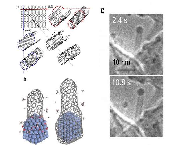 In a recently published paper in Science Advances, Feng Ding of the Center for Multidimensional Carbon Materials, within the Institute of Basic Science (IBS, South Korea) and colleagues, have achieved the creation of a specific type of carbon nanotubes (CNTs) with a selectivity of 90%, and expanded the current theory that explains the synthesis of these promising nano-cylinders. CNTs are incredibly strong and light nanomaterials made of carbon with superior current carrying capacity and very high thermal conductivity, making them ideal for electronic applications. Although CNTs are considered as some of the most interesting materials for the future, scientists are still struggling for their controllable synthesis. The CNTs' shape can be compared to paper tubes: in the same way as a cylinder can be created by rolling a sheet of paper, so CNTs can be imagined as a single layer of graphite rolled up on itself. Similarly, as different tubes can be produced by rolling a paper around its long side, its short side, or diagonally at different angles. Depending on the rolling direction, a graphite layer can produce different CNT structures, some are conducting and others are semiconducting, thus selectively creating a specific type of CNT will be key for their future use, such as building energy efficient computer chips. However, CNTs are not produced by rolling, but are grown nanometer after nanometer, adding carbon at the rim of nano-cylinders, one atom at a time. Despite various studies during the last three decades, the understanding on CNT growth remains very limited and rational experimental design for the growth of specific types of CNTs is challenging. One of the most promising manufacturing methods for CNT is the chemical vapor deposition (CVD). In this process, metal nanoparticles combined with carbon-containing gases form CNTs inside a high-temperature furnace. On the tip of the tubes, the metal nanoparticles play a critical role as catalysts: they dissociate the carbon source from the gases, and assist the attachment of these carbon atoms to the CNT wall, making the tubes longer and longer. The growth of the CNT terminates once the catalyst particle is encapsulated by graphitic or amorphous carbon. Carbon atoms are inserted onto the interface between a growing CNT and a catalyst nanoparticle, in active sites of the rim, and are available to incorporate new atoms. A previous model of CNT's growth rate showed that the latter is proportional to the density of these active sites at the interface between CNT and the catalyst, or the specific structure of the CNT. In this study, the researchers monitored the steady growth of CNTs on a magnesium oxide (MgO) support with carbon monoxide (CO) as the carbon feedstock and cobalt nanoparticles as catalysts at 700oC. The direct experimental measurements of 16 CNTs showed how to expand the previous theory. "It was surprising that the growth rate of a carbon nanotubes only depends on the size of the catalyst particle. This implies that our previous understanding on carbon nanotubes growth was not complete," says Maoshuai He, the first author of the paper. More specifically, carbon atoms that are deposited on the catalyst particle surface can be either incorporated on the active side of the CNT or removed by etching agents, such as H2, H2O, O2, or CO2. To explain the new experimental observations, the team included the effects of carbon insertion and removal during CNT growth and discovered that the growth rate depends on the catalyst's surface area and tube diameter ratio. "Compared to the previous model, we added three more factors: the rate of precursor deposition, the rate of carbon removal by etching agents, and the rate of carbon insertion into a carbon nanotube wall. When feedstock dissociation cannot be balanced by carbon etching, the rate of carbon nanotube growth will no longer depend on the structure of the carbon nanotube. On the other hand, the previous theory is still valid if the etching is dominating," explains Ding, a group leader of the Center for Multidimensional Carbon Materials. Interestingly, the new theory of CNT growth leads to a new mechanism to selectively grow a specific type of CNTs, denoted as (2n, n) CNTs, which is characterized by the maximum number of active sites at the interface between the CNT and the catalyst. This CNT structure would correspond to rolling a sheet of graphite diagonally at an angle of around 19 degrees. "If there is no carbon etching and the carbon nanotubes growth is slow, carbon atoms on the catalyst surface will accumulate," says Jin Zhang, co-author of the study and professor of Peking University, China. "This may lead to the formation of graphitic or amorphous carbon, which are established mechanisms of carbon nanotube growth termination. In this case, only carbon nanotubes which are able to add carbon atoms on their walls, that is with the highest number of active sites, can survive." Guided by the new theoretical understanding, the researchers were able to design experiments that produced (2n, n) CNTs with a selectivity of up to 90%: the highest selective growth of this type of CNT was achieved in the absence of any etching agent and with a high feedstock concentration.
