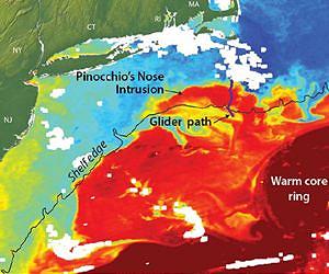 Ocean robots installed off the coast of Massachusetts have helped scientists understand a previously unknown process by which warm Gulf Stream water and colder waters of the continental shelf exchange. The process occurs when offshore waters, originating in the tropics, intrude onto the Mid-Atlantic Bight shelf and meet the waters originating in regions near the Arctic. This process can greatly affect shelf circulation, biogeochemistry and fisheries. In 2006, scientists using satellite imagery observed an elongated body of warm water from a Gulf Stream warm-core ring intruding along the shelf edge, extending hundreds of miles from Massachusetts towards Cape Hatteras, NC. "A lot of people were surprised by this," said Weifeng 'Gordon' Zhang, associate scientist at Woods Hole Oceanographic Institution (WHOI), and lead author of the study published in Geophysical Research Letters. "Normally, the Gulf Stream water, which is very warm and buoyant, doesn't come in direct contact with the water on the continental shelf, which is much colder. There is a cascade of potential implications that need further study." Until now, scientists had been unable to study the phenomenon because satellites can only sense the ocean surface, and no data about the structure of the intrusion water below the surface were available. However, in April 2014, water column data in this area became available from preliminary deployments from the National Science Foundation-funded Ocean Observatories Initiative (OOI). Specifically, autonomous vehicles called "gliders" that collect data along a pre-defined path in the ocean, were deployed at the OOI Pioneer Array site south of Cape Cod. Zhang and his colleagues used preliminary glider data, collected from April through June 2014 and publicly available on the OOI website, to generate the first profile of the complex, layered masses of water at this vital point in the ocean. "The edge of the continental shelf is a key location where dense, nutrient rich water 'upwells' to the surface, stimulating growth at the base of the food web," said co-author Glen Gawarkiewicz, a senior scientist at WHOI. "This water is normally sandwiched between colder, fresher water on the shelf and warmer Gulf Stream waters offshore. Understanding changes in this region has important societal and economic implications." Satellite imagery shows five similar-looking intrusion events have occurred between 2007-2014 in the winter and spring seasons. Zhang and Gawarkiewicz have dubbed the events "Pinocchio's Nose Intrusions" (PNI) because the warm water intrudes onto the shelf and continues to "grow" for hundreds of miles, moving in the opposite direction from the northeastward movement of the Gulf Stream. Until this new research was conducted, one proposed explanation was that the warm waters were swept up in the shelf break jet, a current that moves toward the southwest direction along the shelf edge. Zhang calls this "the deception or lie" of the Pinocchio's Nose Intrusion. "If the intrusion was caused by the shelfbreak jet," said Zhang, "this feature would most likely be a very thin, superficial feature on the surface." In contrast, thanks to the data collected by the OOI Pioneer Array gliders before and after the PNI formed, the scientists determined these intrusions are nearly 100 meters deep, extending almost to the seafloor. Rotating warm core rings form in the deep ocean and eventually pinch off from the Gulf Stream, heading in a northwest direction onto the shallower continental slope. The outer limbs of the rings hit the slope first, and are squeezed by the rising sea floor. Once reaching the shelf, they follow the shelf edge extending to the southwest forming the long nose shape. Eventually, the extension stops, and thin filaments coming out of the north side of the nose penetrate further onto the shelf. The OOI Pioneer Array data also allowed scientists to understand the complexities of what is driving the density of the various water masses at this unique location. Under normal conditions, the density in the region is controlled by the salinity. The shelf water is fresher than offshore water and therefore more buoyant than saltier offshore water. However, during a PNI event, the shelf water is less buoyant than the offshore water because of a huge temperature difference--approximately 25-30 degrees Fahrenheit--between the shelf waters and the intrusion waters. "Because the Gulf Stream water is so outrageously warm, density now is controlled by the temperature, and the intrusion water is more buoyant, despite being saltier," said Zhang. The changes in temperature, density and circulation all have major implications for the fisheries in the area. "I showed the glider data to a group of commercial fisherman back in April, in Rhode Island, and they were very surprised," said Gawarkiewicz. "They couldn't believe the temperature can change by that much, that quickly." The scientists believe the PNI process might assist in the transport of young fish, like American eel, across the shelfbreak barrier and onto the shelf, where they can swim toward coastal estuaries. For American eels, this is an important step of their reproductive migration journey and crucial for their survival. The baby eels have to make it from the spawning ground in the tropics to their estuarine and freshwater habitats on the US northeast coast in the first year of their life. The direct intrusion of the Gulf Stream water onto the shelf can help them reach their destination without being swept away, and may increase their survival rate. But for other species, the intrusion might bring in the low nutrient Gulf Stream surface water and suppress the upwelling of cold, dense, nutrient-rich water, and thereby reduce biological productivity in a region that is otherwise known for its fertile fishing grounds. "I just find it extraordinary that the Pioneer Array gliders were out for a month, and we have already identified a new shelf 