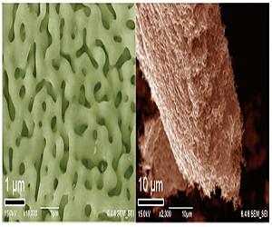 Three-dimentional (3D) nanoporous graphene with preserved 2D Dirac electronic characters was successfully synthesized by Dr. Yoshikazu Ito and Prof. Mingwei CHEN at Advanced Institute for Materials Research (AIMR), Tohoku University. The nanoporous graphene is constructed by a single layer graphene sheet that is continuously inter-connected to form a complex 3D network structure. This free-standing nanoporous graphene with an excellent crystallinity possesses high mobility, holding great promise for the applications in electronic devices. The nanoporous graphene were grown by a nanoporous metal based chemical vapor deposition (CVD) method as shown in Figure 1(a). The overall morphology of the nanoporous graphene in Figure 1(b) shows a ~20 um thick free-standing bulk sheet. Although the 3D nanoporous graphene has a complex structure, it is demonstrated to be 500 cm2/Vs in electron mobility and a mass-less Dirac cone system. As the conventional transistor requires electron mobility of 200 cm2/Vs, it is greatly expected that this nanoporous graphene will bring a new device which can be replaced with Si devices. This work is collaborated with the research teams of Prof. Katsumi Tanigaki and Prof. Takashi Takahashi at AIMR, Tohoku University. This research results will be published in issue 19 of 'Angewandte Chemie International Edition' as a Hot Paper on 2 May. Introduction Graphene is a mono-layer carbon material with low cost, high chemical/thermal stability, and ultrahigh strength and is expected to be a replacement of silicon and noble metals for electron devices, battery materials, photo-/ion detectors and catalysts. Although some of graphene products such as display and electrodes are commercially available, the applications are limited due to the 2D sheet structure. In other words, the performance per gram is excellent but the performance per volume cannot be achieved easily. Therefore, many efforts have been made to construct the 2D material as a 3D structure with retained physical/chemical properties and high volumetric performance. However, the reported 3D nanoporous carbon materials suffer from poor mobility because of the lower crystallinity, which cannot be used for the electron devices. To achieve semiconductor-grade 3D carbon materials, the monolayer graphene sheet with a high crystalline structure is required in a 3D structure. Thus, we have developed a 3D nanoporous graphene with preserved high mobility and unique 2D electronic properties of graphene.