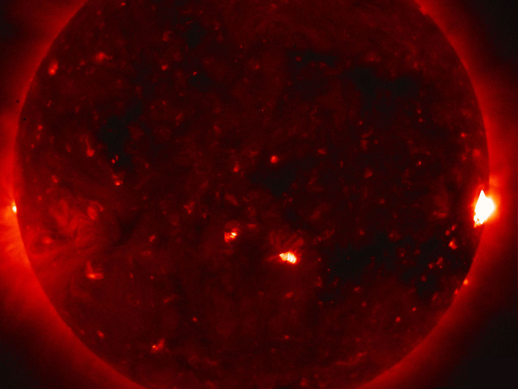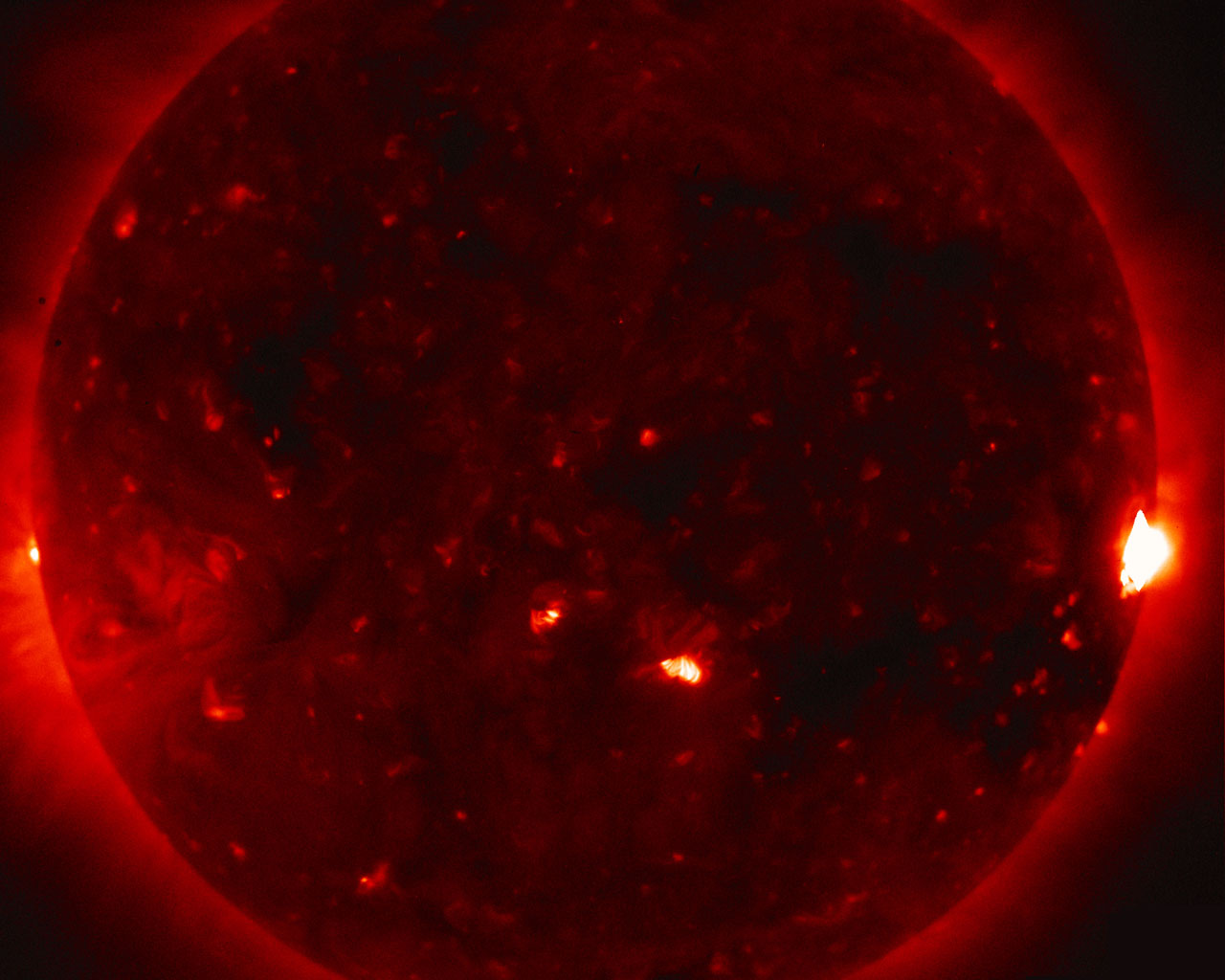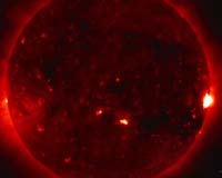 Boston MA (SPX) Nov 01, 2006 Just in time for Halloween, astronomers have taken a haunting new portrait of the sun. In this color-coded image from the Hinode spacecraft, the sun glows eerily orange as though celebrating with earthly spooks. The photograph shows the sun's corona -- the top layer of the sun's atmosphere, a region of extremely rarefied gases heated to millions of degrees. During the current, quiet phase of solar activity (sunspot minimum), the corona is dominated by small regions of closed magnetic field (called X-ray Bright Points) and large dark areas where the magnetic field of the sun extends into interplanetary space (called Coronal Holes). There is also a low level of activity as a few small active regions emerge from inside the sun. When the image is seen at full resolution, compact loops of 3-million-degree gas are clearly seen. Movies made from sequences of images will show how the corona evolves, and what conditions lead to the entire range of solar activity from flares and large-scale eruptions to small-scale magnetic reconnection events and explosive jets. The Hinode spacecraft (formerly Solar-B) carries three telescopes. This image was taken with the X-ray Telescope developed jointly by the Smithsonian Astrophysical Observatory (SAO) and the Japan Aerospace Exploration Agency (JAXA). Hinode's X-ray Telescope is the highest resolution solar X-ray telescope ever flown. It will show the structure and dynamics of the corona over a wide range of temperatures and a broad field of view. Related Links Harvard-Smithsonian Center for Astrophysics More pixs at JAXA Solar Science News at SpaceDaily