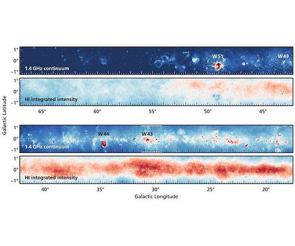 The Milky Way is a spiral galaxy, a disc-shaped island of stars in the cosmos, in which most bright and young stars cluster in spiral arms. There they form from the dense interstellar medium (ISM), which consists of gas (especially hydrogen) and dust (microscopic grains with high abundances of carbon and silicon). In order for new stars to form continuously, material must be constantly flushed into the spiral arms to replenish the supply of gas and dust. A group of astronomers from the University of Calgary in Canada, the Max Planck Institute for Astronomy (MPIA) in Heidelberg and other research institutions have now been able to show that the supply comes from a much hotter component of the ISM, which usually envelops the entire Milky Way. This warm ionized medium (WIM) has an average temperature of 10,000 degrees. High-energy radiation from hot stars causes the hydrogen gas of the WIM to be largely ionised. The results suggest that the WIM condenses in a narrow area near a spiral arm and gradually flows into it while cooling. The scientists discovered the dense WIM by measuring the so-called Faraday rotation, an effect named after the English physicist Michael Faraday. This involves changing the orientation of linearly polarised radio emissions when they pass through a plasma (ionised gas) traversed by a magnetic field. One speaks of polarised radiation when the electric field oscillates in only one plane. Ordinary light is not polarised. The magnitude of the change in polarisation also depends on the observed wavelength. In the present study, recently published in The Astrophysical Journal Letters, astronomers were able to detect an unusually strong signal in a rather inconspicuous area of the Milky Way, which is located directly on the side of the Sagittarius arm of the Milky Way facing the galactic centre. The spiral arm itself stands out in the imaging data due to strong radio emission generated by embedded hot stars and supernova remnants. However, the astronomers found the strongest shift in polarisation outside this prominent zone. They conclude from this that the increased Faraday rotation does not originate within this active part of the spiral arm. Instead, it originates from condensed WIM, which, like the magnetic field, belongs to a less obvious component of the spiral arm. The analysis is based on the THOR survey (The HI/OH Recombination Line Survey of the Milky Way), which has been conducted at MPIA for several years now and in which a large area of the Milky Way is observed at several radio wavelengths. Polarised radio sources such as distant quasars or neutron stars serve as "probes" for determining the Faraday rotation. This allows astronomers not only to detect the otherwise difficult to measure magnetic fields in the Milky Way, but also to study the structure and properties of the hot gas. "We were very surprised by the strong signal in a rather quiet area of the Milky Way," says Henrik Beuther from MPIA, who is leading the THOR project. "These results show us that there is still a lot to be discovered in studying the structure and dynamics of the Milky Way."