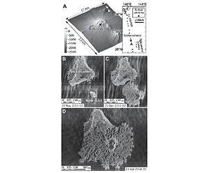 On Nov. 20, 2013, the Japan Maritime Self-Defense Force discovered a small islet near Nishinoshima volcano, Ogasawara Islands, Japan. The exact date of the initial eruption that spawned the islet is unknown, but a thermal anomaly was detected in the area in early November 2013. Fukashi Maeno and colleagues are investigating the creation of this islet, which on the day of its discovery was about 150 by 80 meters in size. Volcanic eruptions in water environments ("Surtseyan eruptions") can result in the production of new islets like this one. However, the entire sequence of such eruptions is rarely observed. Therefore, discovery of the islet so close to the eruption date provides a rare opportunity to learn how a volcanic island is created. On Nov. 21, 2013, Maeno and colleagues carried out aircraft observations of the area and confirmed the Surtseyan eruptions, which within three days changed to Strombolian eruptions, because a pyroclastic cone formed around the vent and prevented external water from flowing into the crater. The most intriguing characteristic of the lava flows, say Maeno and colleagues, was the development of a large number of lobes and tubes. Internal pathways that fed lava to the active flow front were eventually developed and dominated the lava transport. The effects of the lava's contact with seawater as well as the variations in the lava discharge rate on the local and overall scales are also important factors affecting the lava transport system. Research paper: Morphological evolution of a new volcanic islet sustained by compound lava flows Fukashi Maeno et al., Earthquake Research Institute, The University of Tokyo, 1-1-1 Yayoi, Bunkyo-ku, Tokyo 113-0032, Japan.