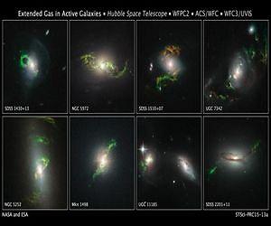 NASA's Hubble Space Telescope has photographed a set of wispy, goblin-green objects that are the ephemeral ghosts of quasars that flickered to life and then faded. The glowing structures have looping, helical, and braided shapes. "They don't fit a single pattern," said Bill Keel of the University of Alabama, Tuscaloosa, who initiated the Hubble survey. Keel believes the features offer insights into the puzzling behavior of galaxies with energetic cores. The ethereal wisps outside the host galaxy are believed to have been illuminated by powerful ultraviolet radiation from a supermassive black hole at the core of the host galaxy. The most active of these galaxy cores are called quasars, where infalling material is heated to a point where a brilliant searchlight shines into deep space. The beam is produced by a disk of glowing, superheated gas encircling the black hole. "However, the quasars are not bright enough now to account for what we're seeing; this is a record of something that happened in the past," Keel said. "The glowing filaments are telling us that the quasars were once emitting more energy, or they are changing very rapidly, which they were not supposed to do." Keel said that one possible explanation is that pairs of co-orbiting black holes are powering the quasars, and this could change their brightness, like using the dimmer switch on a chandelier. The quasar beam caused the once invisible filaments in deep space to glow through a process called photoionization. Oxygen atoms in the filaments absorb light from the quasar and slowly re-emit it over many thousands of years. Other elements detected in the filaments are hydrogen, helium, nitrogen, sulfur, and neon. "The heavy elements occur in modest amounts, adding to the case that the gas originated in the outskirts of the galaxies rather than being blasted out from the nucleus," Keel said. The green filaments are believed to be long tails of gas pulled apart like taffy under gravitational forces resulting from a merger of two galaxies. Rather than being blasted out of the quasar's black hole, these immense structures, tens of thousands of light-years long, are slowly orbiting their host galaxy long after the merger was completed. "We see these twisting dust lanes connecting to the gas, and there's a mathematical model for how that material wraps around in the galaxy," Keel said. Potentially, you can say we're seeing it 1.5 billion years after a smaller gas-rich galaxy fell into a bigger galaxy." The ghostly green structures are so far outside the galaxy that they may not light up until tens of thousands of years after the quasar outburst, and would likewise fade only tens of thousands of years after the quasar itself does. That's the amount of time it would take for the quasar light to reach them. Not coincidentally, galaxy mergers would also trigger the birth of a quasar by pouring material into the central supermassive black hole. The first "green goblin" type of object was found in 2007 by Dutch schoolteacher Hanny van Arkel. She discovered the ghostly structure in the online Galaxy Zoo project. The project has enlisted the public to help classify more than a million galaxies catalogued in the Sloan Digital Sky Survey (SDSS), and moved on to add galaxies seen in Hubble images probing the distant universe. The bizarre feature was dubbed Hanny's Voorwerp, Dutch for Hanny's object. Because his follow-up Hubble images of Hanny's Voorwerp were so intriguing, Keel started a deliberate hunt for more bizarre objects like it. They would share the rare and striking color signature of Hanny's Voorwerp on the SDSS images. Keel had 200 people volunteer specifically to look at over 15,000 galaxies hosting quasars. Each candidate had to have at least 10 views that collectively reveal weirdly colored clouds. Keel's team took the galaxies that looked the most promising and further studied them by dividing their light into its component colors through a process called spectroscopy. In follow-up observations from Kitt Peak National Observatory and the Lick Observatory, his team found 20 galaxies that had gas that was ionized by radiation from a quasar, rather than from the energy of star formation. And, the clouds extended more than 30,000 light-years outside the host galaxies. Eight of the newly discovered clouds were more energetic than would be expected given the amount of radiation coming from the host quasar, even when observed in infrared light by NASA's Wide-field Infrared Survey Explorer (WISE) space telescope. The host quasars were as little as one-tenth the brightness needed to provide enough energy to photoionize the gas. Keel said that presumably the brightness changes are governed by the rate at which material is falling onto the central black hole. Keel speculated that this quasar variability might be explained if there are two massive black holes circling each other in the host galaxy's center. This could conceivably happen after two galaxies merged. A pair of black holes whirling about each other could disrupt the steady flow of infalling gas. This would cause abrupt spikes in the accretion rate and trigger blasts of radiation. When our Milky Way galaxy merges with the Andromeda galaxy (M31) in about 4 billion years, the black holes in each galaxy could wind up orbiting each other. So in the far future, our galactic system could have its own version of Hanny's Voorwerp encircling it.