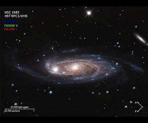 To kickstart the 30th anniversary year of the NASA/ESA Hubble Space Telescope, Hubble has imaged a majestic spiral galaxy. Galaxy UGC 2885 may be the largest known in the local universe. It is 2.5 times wider than our Milky Way and contains 10 times as many stars. Despite its gargantuan size, researchers are calling it a "gentle giant" because it looks as if it has been sitting quietly over billions of years, possibly sipping hydrogen from the filamentary structure of intergalactic space. This is fueling modest ongoing star birth at a rate half that of our Milky Way. In fact, its supermassive central black hole is also a sleeping giant; because the galaxy does not appear to be feeding on much smaller satellite galaxies, it is starved of infalling gas. A number of foreground stars in our Milky Way can be seen in the image, identified by their diffraction spikes. The brightest appears to sit on top of the galaxy's disc, though UGC 2885 is really 232 million light-years farther away. The giant galaxy is located in the northern constellation Perseus. The galaxy has also been nicknamed "Rubin's galaxy," after astronomer Vera Rubin (1928-2016), by Benne Holwerda of the University of Louisville, Kentucky, who observed the galaxy with the Hubble Space Telescope. "My research was in large part inspired by Vera Rubin's work in 1980 on the size of this galaxy," said Holwerda. Rubin measured the galaxy's rotation, providing evidence for dark matter that makes up most of the galaxy's mass. "We consider this a commemorative image. The goal of citing Dr. Rubin in our observation was very much part of our original Hubble proposal." Researchers are still seeking to understand what led to the galaxy's monstrous size. "It's as big as you can make a disk galaxy without hitting anything else in space," added Holwerda. One clue is that the galaxy is fairly isolated in space and doesn't have any nearby galaxies to crash into and disrupt the shape of its disc. Did the monster galaxy gobble up much smaller satellite galaxies over time? Or did it just slowly accrete gas to make new stars? "It seems like it's been puttering along, slowly growing," Holwerda said. Using Hubble's exceptional resolution, his team is counting the number of globular star clusters in the galaxy's halo - a vast shell of faint stars surrounding the galaxy. An excess of clusters would yield evidence that they were captured from smaller infalling galaxies over many billions of years. The upcoming NASA/ESA/CSA James Webb Space Telescope could be used to explore the centre of this galaxy as well as the globular cluster population. The infrared capability of this telescope will give researchers a less impeded view of the underlying stellar populations that will complement Hubble's visible-light ability to track wispy star formation throughout the galaxy.