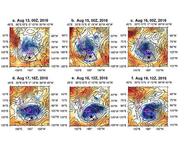 In August 2016 a massive storm on par with a Category 2 hurricane churned in the Arctic Ocean. The cyclone led to the third-lowest sea ice extent ever recorded. But what made the Great Arctic Cyclone of 2016 particularly appealing to scientists was the proximity of the Korean icebreaker Araon. For the first time ever, scientists were able to see exactly what happens to the ocean and sea ice when a cyclone hits. University of Alaska Fairbanks researchers and their international colleagues recently published a new study showing that sea ice declined 5.7 times faster than normal during the storm. They were also able to prove that the rapid decline was driven by cyclone-triggered processes within the ocean. "Generally, when storms come in, they decrease sea ice, but scientists didn't understand what really caused it," said lead author Xiangdong Zhang from the UAF International Arctic Research Center. There was general speculation that sea ice declined solely from atmospheric processes melting ice from above. Zhang and his team proved this theory incomplete using "in-situ" observations from directly inside the cyclone. The measurements reflected things like air and ocean temperature, radiation, wind and ocean currents. It was a stroke of good luck for science, and perhaps a bit nerve-racking for those onboard, that the icebreaker was in position to capture data from the cyclone. Usually ships try to avoid such storms, but Araon had just sailed into the middle of an ice-covered zone and was locked in an ice floe. Thanks to the ship's position so close to the storm, Xiangdong and his team were able to explain that cyclone-related sea ice loss is primarily due to two physical ocean processes. First, strong spinning winds force the surface water to move away from the cyclone. This draws deeper warm water to the surface. Despite this warm water upwelling, a small layer of cool water remains directly beneath the sea ice. That's where a second process comes into play. The strong cyclone winds act like a blender, mixing the surface water. Together, the warm water upwelling and the surface turbulence warm the entire upper ocean water column and melt the sea ice from below. Although the August storm raged for only 10 days, there were lasting effects. "It's not just the storm itself," explained Zhang. "It has lingering effects because of the enhanced ice-albedo feedback." The enlarged patches of open water from the storm absorb more heat, which melts more sea ice, causing even more open water. From Aug. 13-22, the amount of sea ice in the entire Arctic Ocean declined by 230,000 square miles, an area more than twice the size of the state of Arizona. Xiangdong is now working with a new computer model for the Department of Energy to evaluate whether climate change will lead to more Arctic cyclones. Previous research shows that over the past half-century, the number and intensity of cyclones in the Arctic have increased. Some of those storms, like the biggest Arctic cyclone on record in 2012, also led to record low sea ice extent.