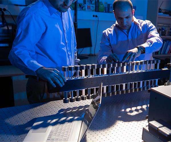 Reciprocity isn't always a good thing. In physics, for example, it concerns electromagnetic and acoustic waves. The idea is that waves travel the same way backward as they do forward. Which is fine, except that waves encounter obstacles (skyscrapers, wind, people) that cause them to lose energy. But what if you could break that rule and guide waves around those obstacles? Or have an object completely absorb the wave in a specific direction? Such functionalities could alter how electronic, photonic and acoustic devices are designed and used. University at Buffalo engineers have taken a step in this direction. Working in an emerging field known to as "spacetime-varying metamaterials," engineers have demonstrated the ability to break reciprocity in acoustic waves. A study describing their work, which is supported by the National Science Foundation, was published Feb. 14 in Physical Review Applied letters, a journal published by the American Physical Society journal. "We have experimentally demonstrated that it's possible to break reciprocity in acoustic waves with material properties that change simultaneously in time and space," says the project's lead investigator Mostafa Nouh, PhD, assistant professor of mechanical and aerospace engineering in the School of Engineering and Applied Sciences. Co-authors are M. Ali Attarzadeh and Jesse Callanan, both PhD candidates in Nouh's lab. To conduct the experiments, Nouh and the students built a beam that consists of a common thermoplastic (acrylonitrile butadiene styrene, or ABS) bar outfitted with 20 aluminum resonators, each shaped like a rectangle. Motors allow the engineers to program each resonator, which are grouped in pairs of four, to spin at 45-degree angle intervals. For example, the first resonator is at 0 degrees, the second at 45 degrees, the third at 90 degrees and the fourth at 135 degrees. The next group of four follows the same pattern, and so on. The spin is both a function of space (the 45-degree intervals) and time (the milliseconds between their angular orientations). Hence the name, spacetime-varying metamaterials. When activated, the spinning resonators look like car pistons that twirl instead of pumping up and down. What they're doing, however, is changing the beam's "stiffness," which is its resistance to being deformed by an applied force. This video explains in greater detail how the system works. Before testing the beam, the team performed computer simulations that predicted reciprocity would break at very fast variations of stiffness. In other words, the faster the resonators spin, the more likely they could break reciprocity. So the engineers cranked the motors up to 2,000 revolutions per minute (rpm). To see if this was fast enough, engineers sent vibrations (an acoustic wave) through the beam via a piezolelectric actuator. Using a scanning laser Doppler vibrometer, as well as a thermal imaging camera (to ensure slight temperature fluctuations weren't influencing the experiment), Nouh and students found that the pattern in which the wave returned to its origin widely diverged from its initial course. "This is evidence of the wave acting in a non-reciprocal manner," says Callanan. In another test, with the resonators spinning only at 100 rpm, the beam's stiffness barely budged. Nouh and students found that the wave returned back to its point of origin the same way it left, indicating that reciprocity was not broken. "The experiments not only demonstrate our ability to break the reciprocity of acoustic waves, but confirm our hypothesis that such breakage is contingent on the speed of stiffness modulations through the spinning action," says Attarzadeh. The ability to manipulate waves in this manner, a first of its kind proof-of-concept, has many possible uses. For example, you could build a wall that allows sound to pass through easily in one direction but not in the opposite way. It could improve how autonomous vehicles communicate with one another. It could increase the resolution of medical imaging via ultrasound, which typically suffers from a limitation called "reflection artifacts" that can lead doctors to misinterpret images. But Nouh cautions the laboratory achievement is not ready for commercialization yet. For example, the beam the team built is large and would need to be scaled-down, likely through 3D printing or other nanofabrication tools. Also, the materials the team used heat up too quickly. To overcome this, more advanced and more expensive materials are likely needed.