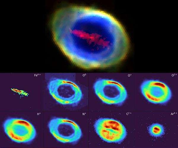 By assembling spectra from the entire face of the Ring Nebula, the team can generate images at individual wavelengths corresponding to specific ions and emission lines. This technique revealed that the familiar outer ring is dominated by light from three different ions of oxygen, while the central bar is highlighted by emission from four-times-ionised iron atoms, seen in the [Fe V] spectral line at a wavelength of 4227 angstroms, or 422.7 nanometres.