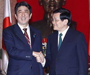 Vietnam and Japan must "play a more active role" in maintaining regional peace and security, Japanese Prime Minister Shinzo Abe said Wednesday, in the face of growing maritime tensions with China. The two countries, both locked in separate bitter disputes with Beijing over contested islands in the resource-rich South China Sea, said they would work towards closer cooperation after talks in Hanoi on Wednesday. Citing "challenging developments" in the Asia-Pacific, Abe -- on his first overseas trip since winning power -- said the two countries should deepen their relationship. They "should increase political and security dialogues and work together," Abe told reporters through a translator after closed-door talks with his Vietnamese counterpart. The countries have "agreed to promote a strategic partnership (and) play a more active role in peace and security in the region", he added. Abe, who scored a handsome election win last month after talking tough on a territorial dispute with China, met Prime Minister Nguyen Tan Dung and other top officials. He will spend less than 24 hours in the communist state before heading to Thailand and Indonesia in an attempt to bolster relations with the vibrant economies of the Association of Southeast Asian Nations bloc. Dung told a joint press briefing the two countries wanted all regional disputes to be resolved "through peaceful negotiations on the basis of international law". He did not elaborate. The two nations are major trade partners and Japan is Vietnam's largest aid donor. Political and security ties are also growing as Japan seeks to shore up regional relationships as a counterweight to an increasingly confident China. Japan and China are locked in a bitter battle over the sovereignty of the Tokyo-controlled Senkaku islands, which Beijing calls the Diaoyus. Vietnam and China have competing claims to the Paracel and Spratley Islands, and regularly trade diplomatic barbs over sovereignty and fishing rights in the contested waters around the archipelagos. China is also involved in an acrimonious territorial dispute with the Philippines over parts of the South China Sea. Abe and Dung also announced a new $500 million pledge of aid Wednesday, without specifying what it was for. Last year Japan became the largest single foreign investor in Vietnam, with major investments in banking, export-orientated manufacturing and consumer goods as Japanese companies eye the rapidly-expanding middle class.