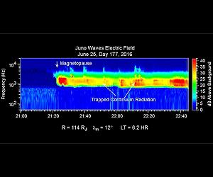 NASA's Jupiter-bound Juno spacecraft has entered the planet's magnetosphere, where the movement of particles in space is controlled by what's going on inside Jupiter. "We've just crossed the boundary into Jupiter's home turf," said Juno Principal Investigator Scott Bolton of Southwest Research Institute, San Antonio. "We're closing in fast on the planet itself and already gaining valuable data." Juno is on course to swing into orbit around Jupiter on July 4. Science instruments on board detected changes in the particles and fields around the spacecraft as it passed from an environment dominated by the interplanetary solar wind into Jupiter's magnetosphere. Data from Juno's Waves investigation, presented as audio stream and color animation, indicate the spacecraft's crossing of the bow shock just outside the magnetosphere on June 24 and the transit into the lower density of the Jovian magnetosphere on July 25. "The bow shock is analogous to a sonic boom," said William Kurth of the University of Iowa in Iowa City, lead co-investigator for the Waves investigation. "The solar wind blows past all the planets at a speed of about a million miles per hour, and where it hits an obstacle, there's all this turbulence." The obstacle is Jupiter's magnetosphere, which is the largest structure in the solar system. "If Jupiter's magnetosphere glowed in visible light, it would be twice the size of the full moon as seen from Earth," Kurth said. And that's the shorter dimension of the teardrop-shaped structure; the dimension extending outward behind Jupiter has a length about five times the distance between Earth and the sun. Out in the solar wind a few days ago, Juno was speeding through an environment that has about 16 particles per cubic inch (one per cubic centimeter). Once it crossed into the magnetosphere, the density was about a hundredfold less. The density is expected to climb again, inside the magnetosphere, as the spacecraft gets closer to Jupiter itself. The motions of these particles traveling under the control of Jupiter's magnetic field will be one type of evidence Juno examines for clues about Jupiter's deep interior. While this transition from the solar wind into the magnetosphere was predicted to occur at some point in time, the structure of the boundary between those two regions proved to be unexpectedly complex, with different instruments reporting unusual signatures both before and after the nominal crossing. "This unusual boundary structure will itself be the subject of scientific investigation," said Barry Mauk of the Johns Hopkins University Applied Physics Laboratory, Laurel, Maryland, who is the instrument lead for the Jupiter Energetic-Particle Detector Instrument (JEDI) on Juno.
