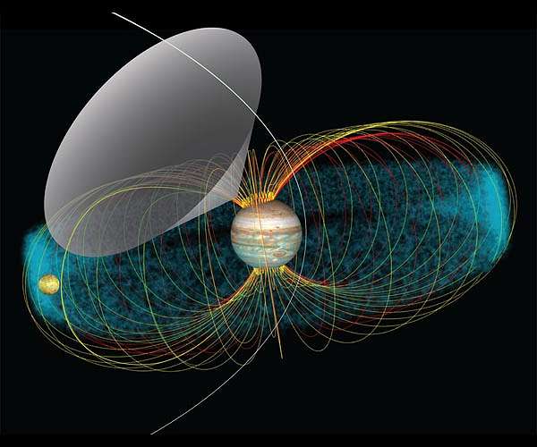By listening to the rain of electrons flowing onto Jupiter from its intensely volcanic moon Io, researchers using NASA's Juno spacecraft have found what triggers the powerful radio emissions within the monster planet's gigantic magnetic field. The new result sheds light on the behavior of the enormous magnetic fields generated by gas-giant planets like Jupiter. Jupiter has the largest, most powerful magnetic field of all the planets in our solar system, with a strength at its source about 20,000 times stronger than Earth's. It is buffeted by the solar wind, a stream of electrically charged particles and magnetic fields constantly blowing from the Sun. Depending on how hard the solar wind blows, Jupiter's magnetic field can extend outward as much as two million miles (3.2 million kilometers) toward the Sun and stretch more than 600 million miles (over 965 million kilometers) away from the Sun, as far as Saturn's orbit. Jupiter has several large moons that orbit within its massive magnetic field, with Io being the closest. Io is caught in a gravitational tug-of-war between Jupiter and the neighboring two of these other large moons, which generates internal heat that powers hundreds of volcanic eruptions across its surface. These volcanoes collectively release one ton of material (gases and particles) per second into space near Jupiter. Some of this material splits up into electrically charged ions and electrons and is rapidly captured by Jupiter's magnetic field. As Jupiter's magnetic field sweeps past Io, electrons from the moon are accelerated along the magnetic field toward Jupiter's poles. Along their way, these electrons generate "decameter" radio waves (so-called decametric radio emissions or DAM). The Juno Waves instrument can "listen" to this radio emission that the raining electrons generate. The researchers used the Juno Waves data to identify the precise locations within Jupiter's vast magnetic field where these radio emissions originated. These locations are where conditions are just right to generate the radio waves; they have the right magnetic field strength and the right density of electrons (not too much and not too little), according to the team. "The radio emission is likely constant, but Juno has to be in the right spot to listen," said Yasmina Martos of NASA's Goddard Space Flight Center, Greenbelt, Maryland and the University of Maryland, College Park. The radio waves emerge from the source along the walls of a hollow cone aligned with and controlled by the strength and shape of the magnetic field of Jupiter. Juno receives the signal only when Jupiter's rotation sweeps that cone over the spacecraft, in the same way a lighthouse beacon shines briefly upon a ship at sea. Martos is lead author of a paper about this research published in June 2020 in the Journal of Geophysical Research, Planets. Data from Juno allowed the team to calculate that the energy of the electrons generating the radio waves was far higher than previously estimated, as much as 23 times greater. Also, the electrons do not necessarily need to come from a volcanic moon. For example, they could be in the planet's magnetic field (magnetosphere) or come from the Sun as part of the solar wind, according to the team.