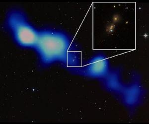A team of astronomers led by ASTRON astronomer Dr. George Heald has discovered a previously unknown gigantic radio galaxy, using initial images from a new, ongoing all-sky radio survey. The galaxy was found using the powerful International LOFAR Telescope (ILT), built and designed by ASTRON. The team is currently performing LOFAR's first all-sky imaging survey, the Multi-frequency Snapshot Sky Survey (MSSS). While browsing the first set of MSSS images, Dr. Heald identified a new source the size of the full moon projected on the sky. The radio emission is associated with material ejected from one member of an interacting galaxy triplet system tens to hundreds of millions of years ago. The physical extent of the material is much larger than the galaxy system itself, extending millions of light years across inter galactic space. The MSSS survey is still ongoing, and is poised to discover many new sources like this one. The new galaxy is a member of a class of objects called Giant Radio Galaxies (GRGs). GRGs are a type of radio galaxy with extremely large physical size, suggesting that they are either very powerful or very old. LOFAR is an effective tool to find new GRGs like this one because of its extreme sensitivity to such large objects, combined with its operation at low frequencies that are well suited to observing old sources. The center of the new GRG is associated with one member of a galaxy triplet known as UGC 09555. The central galaxy is located at a redshift of z=0.054536, or 750 million light years from Earth. The central radio source was previously known and has a flat radio spectrum, typical of giant radio galaxies. LOFAR's MSSS survey is a concerted effort to image the entire northern sky at very low radio frequencies, between 30 and 160 MHz (wavelengths from 2m to 10m). The primary aim of the survey is to perform an initial shallow scan of the sky, in order to create an all-sky model that will support the calibration of much deeper observations. It is comparable in sensitivity and angular resolution to previous surveys with 'classical' radio telescopes like the Very Large Array (VLA) in the USA, ASTRON's Westerbork Synthesis Radio Telescope (WSRT), and the Giant Metrewave Radio Telescope (GMRT) in India. MSSS is unique in that it operates at substantially lower frequencies, and is therefore poised to uncover new sources that were missed by previous surveys. Its broad bandwidth coverage is also novel in all-sky radio surveys, and will be used to provide additional information about the detected objects. The international team of astronomers that is performing the MSSS survey is made up of about fifty members from various institutes, mostly in the Netherlands, Germany, the UK, Poland, France and Italy.