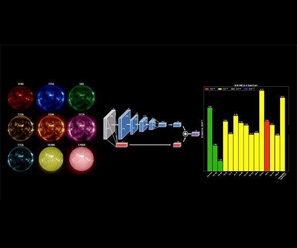 A NASA Frontier Development Lab (FDL) team has shown that by using deep learning, it is possible to virtually monitor the Sun's extreme ultraviolet (EUV) irradiance, which is a key driver of space weather. The Sun is vital for survival, but solar flares, which typically occur a few times a year, have the potential to cause severe disruptions in space and on Earth. These disruptions can impact spacecraft, satellites and even systems here on Earth, including GPS navigation, radio communications and the power grid. Deep learning can help get more value out of our current ability to monitor the Sun by providing virtual instruments to supplement physical devices. This research will be published in Science Advances on October 2, 2019 ("A Deep Learning Virtual Instrument for Monitoring Solar Extreme Ultraviolet Spectral Irradiance"). "Our research shows how a deep neural network can be trained to mimic an instrument on the Solar Dynamics Observatory (SDO)," said FDL team member and co-author Alexander Szenicer (Oxford University). "By inferring what ultraviolet radiation levels that sensor would have detected based on what the other instruments on SDO are observing at any given time, we demonstrate it is possible to increase scientific productivity of NASA missions and to increase our capability to monitor solar sources of space weather." FDL is a partnership between NASA Ames Research Center, the SETI Institute and private sector and space agency partners including Google Cloud, Intel AI, IBM, Kx Lockheed Martin, Luxembourg Space Agency, NVIDIA, Canadian Space Agency, HPE and Element AI. During an 8-week summer research accelerator, interdisciplinary teams comprised of early career researchers in AI and natural science domains work together to apply AI and machine learning to address important challenge questions. The challenge question behind this research was to develop an AI model using SDO images to predict solar spectral irradiance. Traditionally, methods for monitoring solar EUV spectral irradiance include physics-inspired models that attempt to predict EUV emission. Such methods use either magnetic field distributions on the Sun's surface or physics-based inversions of the plasma distribution in the Sun's corona. These new results show it is possible to use imaging observations of the Sun to create a proxy measurement of EUV spectral irradiance. Feeding coronal images from NASA's SDO to a deep neural network allows us to generate proxy EUV measurements with an accuracy that surpasses physics-based models. Additionally, the team developed benchmarks and protocols for comparing predictions between EUV models. These will be useful for future studies. Thus far, research has barely scratched the surface on what's feasible by combining deep learning with large-scale scientific space data. Data science and machine learning will play increasingly important roles in our endeavor to understand the origins of space weather and how to live with the Sun.