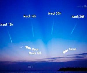 Look west around the middle of twilight on a clear evening this week, and with a little luck - and maybe binoculars - you might spot a one-time-only visitor newly arrived from very deep space. Skywatchers have been anticipating Comet PanSTARRS for almost two years. A few days ago it passed closest by the Earth and is now being lit most brilliantly by the Sun. In the past couple weeks it decorated the twilight sky for folks in the Southern Hemisphere. Now people in the world's mid-northern latitudes have their turn.The comet should be at its best March 12-18, possibly just bright enough to spot with the unaided eye in clear twilight if you know exactly where to look. "Our good views should begin around March 12th and 13th, when the crescent Moon is there to point the way," says Alan MacRobert, a senior editor at Sky and Telescope magazine. "Before then the comet is too near the horizon. It will start fading later this week, so if the sky is clear, don't miss your chance." By March 20th it should be only half as bright as it was seven days before, but on the other hand it will be a little higher and seen through thinner, clearer air. The best time to look is about 30 to 45 minutes after your local sunset time. This narrow window of viewing time comes after twilight fades enough for the comet to show through at all, but before it sinks too low and sets. On Tuesday March 12th, look for the very thin crescent Moon very low due west. The comet will be just to its left, by two or three finger-widths at arm's length. On Wednesday March 13th, you'll see a thicker crescent Moon higher up. Look below it by about the width of your fist at arm's length. On Thursday the 14th, look two fists below the Moon and perhaps a bit to the right. After that, the comet will gradually move to the right from evening to evening as it begins to fade. Look for a fuzzy star with a short upward tail. Binoculars will give a much better view. And if you have a telescope, now's the time to bring it out! The comet is known to astronomers as C/2011 L4 to distinguish it from others named PanSTARRS. The automated Pan-STARRS sky survey telescope in Hawaii discovered it in June 2011 as a tiny, distant speck heading in from the far reaches of the solar system. Even though it's passing closest to us around now, it's still a distant 105 million miles or so from Earth, rather far even by comet standards. That's why it looks small. "What we're seeing," says Sky and Telescope editor in chief Robert Naeye, "is mostly a huge plume of dust, lit by sunlight, that's spraying from the comet's tiny little nucleus. The nucleus is an icy frozen dirtball just a few miles across. As it comes near the Sun, its surface heats up and some of the ice evaporates, letting loose dust and debris." Comet PanSTARRS is on an orbit that's bringing it by the Sun for the first time, after it has spent billions of years in the cold of deep space. In the coming months it will fly back out again, never to return. This is the first of two promising comets for 2013. The other is Comet ISON, which may put on a brighter display in the dawn sky of early December (for more about that one, see here).