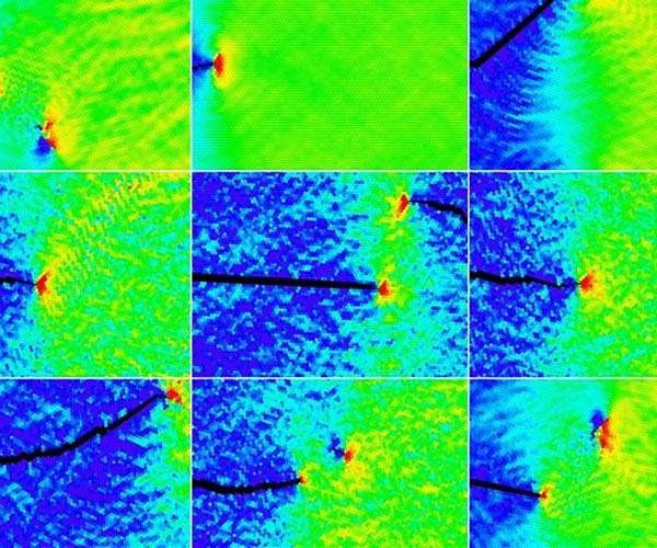 For engineers developing new materials or protective coatings, there are billions of different possibilities to sort through. Lab tests or even detailed computer simulations to determine their exact properties, such as toughness, can take hours, days, or more for each variation. Now, a new artificial intelligence-based approach developed at MIT could reduce that to a matter of milliseconds, making it practical to screen vast arrays of candidate materials. The system, which MIT researchers hope could be used to develop stronger protective coatings or structural materials - for example, to protect aircraft or spacecraft from impacts - is described in a paper in the journal Matter, by MIT postdoc Chi-Hua Yu, civil and environmental engineering professor and department head Markus J. Buehler, and Yu-Chuan Hsu at the National Taiwan University. The focus of this work was on predicting the way a material would break or fracture, by analyzing the propagation of cracks through the material's molecular structure. Buehler and his colleagues have spent many years studying fractures and other failure modes in great detail, since understanding failure processes is key to developing robust, reliable materials. "One of the specialties of my lab is to use what we call molecular dynamics simulations, or basically atom-by-atom simulations" of such processes, Buehler says. These simulations provide a chemically accurate description of how fracturing happens, he says. But it's slow, because it requires solving equations of motion for every single atom. "It takes a lot of time to simulate these processes," he says. The team decided to explore ways of streamlining that process, using a machine-learning system. "We're kind of taking a detour," he says. "We've been asking, what if you had just the observation of how fracturing happens [in a given material], and let computers learn this relationship itself?" To do that, artificial intelligence (AI) systems need a variety of examples to use as a training set, to learn about the correlations between the material's characteristics and its performance. In this case, they were looking at a variety of composite, layered coatings made of crystalline materials. The variables included the composition of the layers and the relative orientations of their orderly crystal structures, and the way those materials each responded to fracturing, based on the molecular dynamics simulations. "We basically simulate, atom by atom, how materials break, and we record that information," Buehler says. They painstakingly generated hundreds of such simulations, with a wide variety of structures, and subjected each one to many different simulated fractures. Then they fed large amounts of data about all these simulations into their AI system, to see if it could discover the underlying physical principles and predict the performance of a new material that was not part of the training set. And it did. "That's the really exciting thing," Buehler says, "because the computer simulation through AI can do what normally takes a very long time using molecular dynamics, or using finite element simulations, which are another way that engineers solve this problem, and it's very slow as well. So, this is a whole new way of simulating how materials fail." How materials fail is crucial information for any engineering project, Buehler emphasizes. Materials failures such as fractures are "one of the biggest reasons for losses in any industry. For inspecting planes or trains or cars, or for roads or infrastructure, or concrete, or steel corrosion, or to understand the fracture of biological tissues such as bone, the ability to simulate fracturing with AI, and doing that quickly and very efficiently, is a real game changer." The improvement in speed produced by using this method is remarkable. Hsu explains that "for single simulations in molecular dynamics, it has taken several hours to run the simulations, but in this artificial intelligence prediction, it only takes 10 milliseconds to go through all the predictions from the patterns, and show how a crack forms step by step." The method they developed is quite generalizable, Buehler says. "Even though in our paper we only applied it to one material with different crystal orientations, you can apply this methodology to much more complex materials." And while they used data from atomistic simulations, the system could also be used to make predictions on the basis of experimental data such as images of a material undergoing fracturing. "If we had a new material that we've never simulated before," he says, "if we have a lot of images of the fracturing process, we can feed that data into the machine-learning model as well." Whatever the input, simulated or experimental, the AI system essentially goes through the evolving process frame by frame, noting how each image differs from the one before in order to learn the underlying dynamics. For example, as researchers make use of the new facilities in MIT.nano, the Institute's facility dedicated to fabricating and testing materials at the nanoscale, vast amounts of new data about a variety of synthesized materials will be generated. "As we have more and more high-throughput experimental techniques that can produce a lot of images very quickly, in an automated way, these kind of data sources can immediately be fed into the machine-learning model," Buehler says. "We really think that the future will be one where we have a lot more integration between experiment and simulation, much more than we have in the past." The system could be applied not just to fracturing, as the team did in this initial demonstration, but to a wide variety of processes unfolding over time, he says, such as diffusion of one material into another, or corrosion processes. "Anytime where you have evolutions of physical fields, and we want to know how these fields evolve as a function of the microstructure," he says, this method could be a boon.