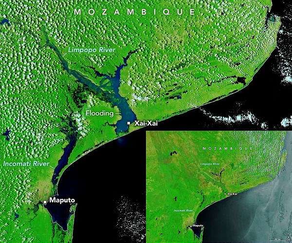 The false color view highlights how water has poured out of the river channels and reservoirs and spread across agricultural land and settlements. A natural color version of the scene shows thick, sediment-laden plumes flowing through the river systems and discharging into the Mozambique Channel, signaling strong erosion and runoff from upstream catchments. Labels in the satellite imagery mark the locations of key urban centers such as Xai-Xai and Maputo, underscoring how close the floodwaters have come to major population centers.