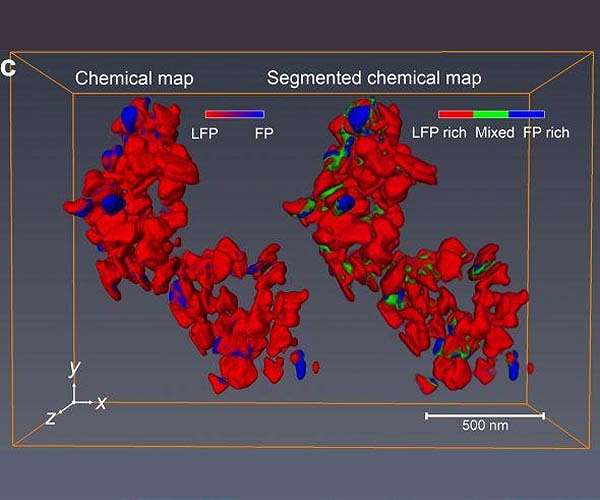 Researchers from the University of Illinois at Chicago and Lawrence Berkeley National Laboratory have developed a new technique that lets them pinpoint the location of chemical reactions happening inside lithium-ion batteries in three dimensions at the nanoscale level. Their results are published in the journal Nature Communications. "Knowing the precise locations of chemical reactions within individual nanoparticles that are participating in those reactions helps us to identify how a battery operates and uncover how the battery might be optimized to make it work even better," said Jordi Cabana, associate professor of chemistry at UIC and co-corresponding author on the paper. As a battery charges and discharges, its electrodes - the materials where the reactions that produce energy take place - are alternately oxidized and reduced. The chemical pathways by which these reactions take place help determine how quickly a battery becomes depleted. Tools available to study these reactions can only provide information on the average composition of electrodes at any given point in time. For example, they can let a researcher know what percentage of the electrode has become permanently oxidized. But these tools cannot provide information on the location of oxidized portions in the electrode. Because of these limitations, it is not possible to tell if reactions are confined to a certain area of the electrode, such as the surface of the material, or if reactions are taking place uniformly throughout the electrode. "Being able to tell if there is a tendency for a reaction to take place in a specific part of the electrode, and better yet, the location of reactions within individual nanoparticles in the electrode, would be extremely useful because then you could understand how those localized reactions correlate with the behavior of the battery, such as its charging time or the number of recharge cycles it can undergo efficiently," Cabana said. The new technique, called X-ray ptychographic tomography, came about through a partnership between chemists at UIC and scientists at the Advanced Light Source, at Lawrence Berkeley National Laboratory in California. Advanced Light Source scientists developed the instrumentation and measurement algorithms, which were used to help answer fundamental questions about battery materials and behavior identified by the UIC team. Together, the two teams used the tomographic technique to look at tens of nanoparticles of lithium-iron phosphate recovered from a battery electrode that had been partially charged. The researchers used a coherent, nanoscale beam of X-rays generated by the high-flux synchrotron accelerator at the Advanced Light Source to interrogate each nanoparticle. The pattern of absorption of the beam by the material gave the researchers information about the oxidation state of iron in the nanoparticles in the X-ray beam. Because they were able to move the beam just a few nanometers over and run their interrogation again, the team could reconstruct chemical maps of the nanoparticles with a resolution of about 11 nanometers. By rotating the material in space, they could create a three-dimensional tomographic reconstruction of the oxidation states of each nanoparticle. In other words, they could tell the extent to which an individual nanoparticle of lithium iron phosphate had reacted. "Using our new technique, we could not only see that individual nanoparticles showed different extents of reaction at a given time, but also how the reaction worked its way through the interior of each nanoparticle," Cabana said.