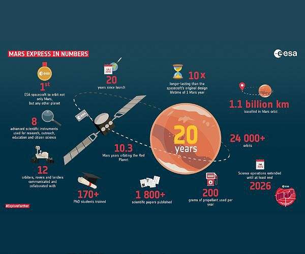 The Mars Express orbiter is not only one of the longest-serving spacecrafts in Mars' orbit, but also one of the most successful in terms of its scientific contributions. It has facilitated over 1.8k scientific publications and trained more than 170 doctoral students with its data. Over the course of its mission, Mars Express has travelled 1.1 billion kilometers in over 24,000 orbits around Mars. These milestones were detailed in an infographic the ESA released to commemorate the mission's 15-year anniversary in 2019.