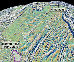 An international team of scientists has discovered the first oceanic microplate in the Indian Ocean - helping identify when the initial collision between India and Eurasia occurred, leading to the birth of the Himalayas. Although there are at least seven microplates known in the Pacific Ocean, this is the first ancient Indian Ocean microplate to be discovered. Radar beam images from an orbiting satellite have helped put together pieces of this plate tectonic jigsaw and pinpointed the age for the collision, whose precise date has divided scientists for decades. Reported in Earth and Planetary Science Letters, the team of Australian and US scientists believe the collision occurred 47 million years ago when India and Eurasia initially smashed into each other. Researchers led by the University of Sydney School of Geosciences discovered that crustal stresses caused by the initial collision cracked the Antarctic Plate far away from the collisional zone and broke off a fragment the size of Australia's Tasmania in a remote patch of the central Indian Ocean. The authors, comprising Professor Dietmar Muller and Dr Kara Matthews from the University of Sydney and Professor David Sandwell from the Scripps Institution of Oceanography, have named the ancient Indian microplate the Mammerickx Microplate, after Dr Jacqueline Mammerickx, a pioneer in seafloor mapping. The Mammerickx Microplate rotation is revealed by a rotating pattern of grooves and hills that turn the topography of the ocean floor into a jagged landscape. These so-called "abyssal hills" record a sudden increase in crustal stress, dating the birth of the Himalayan Mountain Range to 47 million years ago. The ongoing tectonic collision between the two continents produces geological stresses that build up along the Himalayas and leads to numerous earthquakes every year - but this latest finding indicates how stressed the Indian Plate became when its northern edge first collided with Eurasia. The new research shows that 50 million years ago, India was travelling northwards at speeds of some 15 centimetres a year - close to the plate tectonic speed limit. Soon after it slammed into Eurasia crustal stresses along the mid-ocean ridge between India and Antarctica intensified to breaking point. A chunk of Antarctica's crust broke off and started rotating like a ball bearing, creating the newly discovered tectonic plate. The discovery was made using satellite radar beam mapping from space, which measures the bumps and dips of the sea surface caused by water being attracted by submarine mountains and valleys, combined with conventional marine geophysical data. Lead author Dr Matthews explains: "The age of the largest continental collision on Earth has long been controversial, with age-estimates ranging from at least 59 to 34 million years ago. "Knowing this age is particularly important for understanding the link between the growth of mountain belts and major climate change." Co-author Professor Muller said: "Dating this collision requires looking at a complex set of geological and geophysical data, and no doubt discussion about when this major collision first started will continue, but we have added a completely new, independent observation, which has not been previously used to unravel the birth of this collision. "It is beyond doubt that the collision must have led to a major change in India's crustal stress field - that's why the plate fragmentation we mapped is a bit like a smoking gun for pinning down the collision age." Co-author Professor Sandwell from the Scripps Institution of Oceanography said humans had explored and mapped remote lands extensively but the same was not true for our ocean basins. "We have more detailed maps of Pluto than we do of most of our own planet because about 71 per cent of the Earth's surface is covered with water," Professor Sandwell said. "Roughly 90% of the seafloor is uncharted by ships and it would take 200 ship-years of time to make a complete survey of the deep ocean outside continental shelves, at a cost of between two- to three billion US dollars. "That's why advances in comparatively low-cost satellite technology are the key to charting the deep, relatively unknown abyssal plains, at the bottom of the ocean." The paper 'Oceanic microplate formation records the onset of India-Eurasia collision' was be published in Earth and Planetary Science Letters last week.