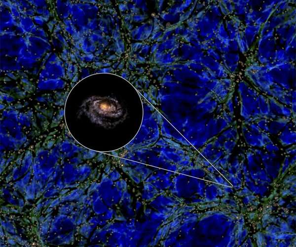 Is the Milky Way special, or, at least, is it in a special place in the Universe? An international team of astronomers has found that the answer to that question is yes, in a way not previously appreciated. A new study shows that the Milky Way is too big for its "cosmological wall", something yet to be seen in other galaxies. The new research is published in Monthly Notices of the Royal Astronomical Society. A cosmological wall is a flattened arrangement of galaxies found surrounding other galaxies, characterised by particularly empty regions called 'voids' on either side of it. These voids seem to squash the galaxies together into a pancake-like shape to make the flattened arrangement. This wall environment, in this case called the Local Sheet, influences how The Milky Way and nearby galaxies rotate around their axes, in a more organised way than if we were in a random place in the Universe, without a wall. Typically, galaxies tend to be significantly smaller than this so-called wall. The Milky Way is found to be surprisingly massive in comparison to its cosmological wall, a rare cosmic occurrence. The new findings are based on a state-of-the-art computer simulation, part of the IllustrisTNG project. The team simulated a volume of the Universe nearly a billion light-years across that contains millions of galaxies. Only a handful - about a millionth of all the galaxies in the simulation - were as "special" as the Milky Way, i.e. both embedded in a cosmological wall like the Local Sheet, and as massive as our home galaxy. According to the team, it may be necessary to take into account the special environment around the Milky Way when running simulations, to avoid a so-called "Copernican bias" in making scientific inference from the galaxies around us. This bias, describing the successive removal of our special status in the nearly 500 years since Copernicus demoted the Earth from being at the centre of the cosmos, would come from assuming that we reside in a completely average place in the Universe. To simulate observations, astronomers sometimes assume that any point in a simulation such as IllustrisTNG is as good as any, but the team's findings indicate that it may be important to use precise locations to make such measurements. "So, the Milky Way is, in a way, special," said research lead Miguel Aragon. "The Earth is very obviously special, the only home of life that we know. But it's not the centre of the Universe, or even the Solar System. And the Sun is just an ordinary star among billions in the Milky Way. Even our galaxy seemed to be just another spiral galaxy among billions of others in the observable Universe." "The Milky Way doesn't have a particularly special mass, or type. There are lots of spiral galaxies that look roughly like it," Joe Silk, another of the researchers, said. "But it is rare if you take into account its surroundings. If you could see the nearest dozen or so large galaxies easily in the sky, you would see that they all nearly lie on a ring, embedded inthe Local Sheet. That's a little bit special in itself. What we newly found is that other walls of galaxies in the Universe like the Local Sheet very seldom seem to have a galaxy inside them that's as massive as the Milky Way." "You might have to travel a half a billion light years from the Milky Way, past many, many galaxies, to find another cosmological wall with a galaxy like ours," Aragon said. He adds, "That's a couple of hundred times farther away than the nearest large galaxy around us, Andromeda." "You do have to be careful, though, choosing properties that qualify as 'special,'" Neyrinck, another member of the team, said. "If we added a ridiculously restrictive condition on a galaxy, such as that it must contain the paper we wrote about this, we would certainly be the only galaxy in the observable Universe like that. But we think this 'too big for its wall' property is physically meaningful and observationally relevant enough to call out as really being special."