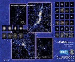 A new, large-scale computer simulation has shown for the first time that large disk galaxies, much like our own Milky Way, may have existed in the early days of the universe. The simulation, created by physicists at Carnegie Mellon University's McWilliams Center for Cosmology and the University of California Berkeley, shows that the early universe --a mere 500 million years after the Big Bang - might have had more order and structure than previously thought. Their findings, which will be published in The Astrophysical Journal Letters, will help guide researchers using next-generation telescopes like the Wide Field Infrared Survey Telescope (WFIRST) and the James Webb Space Telescope (JWST) as they search the sky for evidence of the first galaxies. "It's awe inspiring to think that galaxies much like our own existed when the universe was so young," said Tiziana Di Matteo, professor of physics at Carnegie Mellon. "The deepest Hubble Space Telescope observations have thus only covered small volumes of space and have found very irregular, clumpy galaxies at these early epochs. It is not surprising that in these small volumes some of the small galaxies do not have regular morphologies like large disk galaxies. Similarly, numerical simulations have been limited in size so they have only made predictions for the smaller, clumpier galaxies at these early times." Di Matteo and fellow CMU Physics Professor Rupert Croft have long been at the forefront of simulation cosmology, completing some of the largest simulations ever created. Their current simulation, called BlueTides, is 100 times larger than previous simulations. It was so large that it monopolized all of the National Science Foundation (NSF) supercomputer BlueWater's memory and almost 1 million CPUs in order to complete the simulation. Di Matteo, Croft and their former graduate student Yu Feng, now a post-doctoral researcher at UC Berkeley, began by seeding their simulation with constraints provided by the cold dark matter theory, the prevailing theory that explains what may have happened in the universe after the Big Bang. After the simulation was completed, the researchers looked at their data to see what they could find, much like observational cosmologists would do with data gathered using a telescope. They were surprised to find a number of disk galaxies in the universe at 500 million years post-Big Bang. Since disk galaxies are so large and complex, most researchers assumed that they would take a very long time to form and would be rare, if they existed at all, in the early universe. "Theoretically we thought that when the universe was only 5 percent of its present age, it would be a place full of chaos and disorder," Croft said. "Our simulation showed that the early universe might be far from being just this. It might contain beautiful symmetrical galaxies, like the Milky Way." From their simulation, the researchers were able to make predictions about the galaxies' luminosities, angular sizes, morphologies, colors and expected number. When telescopes like WFIRST and JWST come online, they will be able to search for galaxies that fit the descriptions developed by the BlueTides simulation. If simulation and observational results match, it could be a strong proof of the cold dark matter theory. "Right now, we're converging on an exciting time in cosmology. Previously, we couldn't study disk galaxies in the early universe using telescopes because the galaxies were so faint and rare. We couldn't study them in a computer because no computers were large enough to cope," Di Matteo said. "The technology has caught up, and we can complete the simulations using today's large supercomputers, and we will be able to use telescopes like WFIRST to make the observations."
