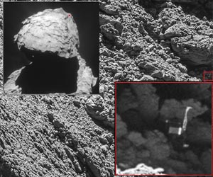 Europe's Rosetta spacecraft has finally spotted its tiny lander Philae, thought to be lost forever, stuck in a ditch on the surface of a comet hurtling through space, ground controllers said Monday. "THE SEARCH IS OVER! I've found @Philae2014!!" the European Space Agency (ESA) tweeted on behalf of Rosetta, orbiting comet 67P/Churyumov-Gerasimenko at some 682 million kilometres (424 million miles) from Earth. The agency released a photo of the washing machine-sized robot lab on the comet's rough surface, one of its three legs thrust dramatically into the air. This was the first sighting of Philae since its rough landing in November 2014. The image was captured by Rosetta's OSIRIS narrow-angle camera on Friday and downloaded two days later -- just weeks before the official end of the ground-breaking science mission to unravel the mysteries of life on Earth. "With only a month left of the Rosetta mission, we are so happy to have finally imaged Philae and to see it in such amazing detail," Cecilia Tubiana of the OSIRIS camera team, the first person to see the images, said in a statement. The Twitter page of Philae, its communications unit switched off in July, remained silent. The 100-kilogramme (220-pound) probe touched down on comet 67P in November 2014, after a 10-year, 6.5 billion kilometre (four billion-mile) journey piggybacking on Rosetta. Philae bounced several times after its harpoons failed to fire, and ended up in a ditch shadowed from the Sun's battery-replenishing rays. Until now, nobody knew exactly where. - The final hour - The tiny lab managed to conduct 60 hours of experiments and send home data before running out of power and entering standby mode on November 15, 2014. "We were beginning to think that Philae would remain lost forever. It is incredible that we have captured this at the final hour," said Rosetta mission manager Patrick Martin. The photo was taken at a distance of 2.7 kilometres from the surface of the comet, which is speeding away from the Sun at nearly 15 kilometres per second. Rosetta is drawing closer to the comet for its own swansong. On September 30, Rosetta will crashland and join Philae on the surface -- their eternal resting place. After it touches down, communications with the craft will be severed once and for all, closing the historic mission. The 1.3-billion-euro ($1.4-billion) project was conceived to unravel the secrets of comets -- believed to be time capsules from the birth of the Solar System. The comet-sniffing and -prodding exploits of Rosetta and Philae were closely followed around the world via cartoon recreations of the pioneering pair. Philae, in particular, earned a loyal Twitter following. In June 2015, as it drew closer to the Sun, some 30,000 people retweeted Philae's unexpected reawakening: "Hello Earth! Can you hear me?" After eight intermittent communications with ground control, Philae fell forever silent in July 2015. "Philae is at the foot of a cliff in an extremely rocky zone" of the comet, Rosetta project chief Philippe Gaudon of France's CNES space agency told AFP, after examining the picture. It is now clear that after bouncing, Philae landed the wrong-way up, "with one foot well in the air and its antennas pointing... groundwards," he said. That is why communicating with Philae had been so difficult. "This wonderful news means that we now have the missing 'ground-truth' information needed to put Philae's three days of science into proper context, now that we know where that ground actually is," said Rosetta project scientist Matt Taylor.
