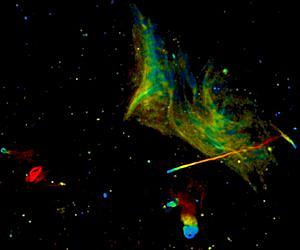 Researchers using the Karl G. Jansky Very Large Array (VLA) have produced the most detailed image yet of a fascinating region where clusters of hundreds of galaxies are colliding, creating a rich variety of mysterious phenomena visible only to radio telescopes. The scientists took advantage of new VLA capabilities to make a "true color" radio image. This image shows the region as it would appear if human eyes were sensitive to radio waves instead of light waves. In this image, red shows where longer radio waves predominate, and blue shows where shorter radio waves predominate, following the pattern we see in visible light. The image shows a number of strange features the astronomers think are related to an ongoing collision of galaxy clusters. The region is called Abell 2256, and is about 800 million light-years from Earth and some 4 million light-years across. The image covers an area in the sky almost as large as the full moon. Studied by astronomers for more than half a century with telescopes ranging from radio to X-ray, Abell 2256 contains a fascinating variety of objects, many of whose exact origins remain unclear. With monikers such as "Large Relic," "Halo," and "Long Tail," the features in this region are seen in greater fidelity than ever before, said Frazer Owen, of the National Radio Astronomy Observatory (NRAO). "The image reveals details of the interactions between the two merging clusters and suggests that previously unexpected physical processes are at work in such encounters," he said. Owen worked with Lawrence Rudnick of the University of Minnesota; Jean Eilek of New Mexico Tech; and Urvashi Rau, Sanjay Bhatnagar, and Leonid Kogan of NRAO. The researchers presented their results in the Astrophysical Journal.