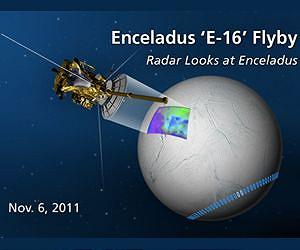 NASA's Cassini spacecraft will acquire the first detailed radar images of Saturn's moon Enceladus during a flyby on Sunday, Nov. 6. These will be the first high-resolution radar observations made of an icy moon other than Titan. The results will provide new information about the surface of Enceladus and enable researchers to compare its geological features as seen by radar with those of Titan. The spacecraft will fly past Enceladus at a distance of about 300 miles (500 kilometers) at its closest point. During the encounter, Cassini's synthetic aperture radar will sweep across a long, narrow swath of the surface just north of the moon's south pole. Cassini will use other radar techniques to map much more of the surface of Enceladus at lower resolutions and determine some of the surface's physical properties as the spacecraft approaches and then speeds away from the icy body. During this flyby, the mission's visible-light cameras will take images of Enceladus and its famous jets, and the composite infrared spectrometer will make new measurements of hot spots from which the jets emerge. Cassini's ultraviolet imaging spectrograph will also make distant observations of Saturn's moon Dione and its environment.