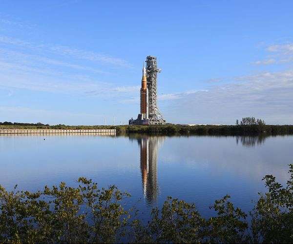 The immense orange and white Space Launch System rocket and the Orion vessel were slowly wheeled out of the Vehicle Assembly Building at the Kennedy Space Center in Florida, and painstakingly moved four miles (6.5 kilometers) to Launch Pad 39B.