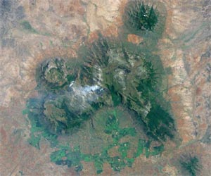 Mulanje Massif is rather impressive from ground level; but it may be most stunning from 440 miles above Earth's surface. That's the vantage point through which NASA's Landsat 8, one of the agency's Earth Observation satellites, viewed the Malawian mountain top most recently. The isolated outcropping of rock -- a geologic feature known as an inselberg or monadnock -- rises abruptly from the dry surrounding plains of Malawi's tea-rowing district, Chiradzulu. The isolated mimi mountain rises 4,500 feet -- the product of massive globs of granite and syenite that bubbled from beneath some 130 million years. While the latest photos from Landsat 8's camera, the Operational Land Imager, don't do justice to Mulanje's verticality, it does document the climatological effects of precipitous elevation changes. Mallanje Massif is located in southern Malawi, near the border with Mozambique. Because the region is currently experiencing its dry season, the forested monadnock offers quite a contrast to the surrounding brown and orange plains. The mountain's sharp rise is enough for it to disturb induced air flow, causing clouds to form and squeezing rain from the otherwise dry atmosphere. The precipitation not only enables forests, but also supplies water to nearly all of Malawi's rivers. The mountain's elevation -- and the resulting levels of rain -- determines the type of forest. Mulanje's lower slopes feature mostly miombo woodlands. Higher up, appearing in dark green, are afromontane forests, dense vegetation dominated by African conifers of the genus Podocarpus and Afrocarpus. The upper elevations also feature clusters of the endangered Mulanje cypress (Widdringtonia whytei), Malawi's national tree. Landsat 8's latest pictures of Malanje, captured in October, also features evidence of a forest fire. "Fires are frequent and a bad sign, often set by illegal loggers," field researcher Joy Hecht, an environmental economist and consultant, told NASA. "The mountain top is a protected forest, and there would not be prescribed burns there."