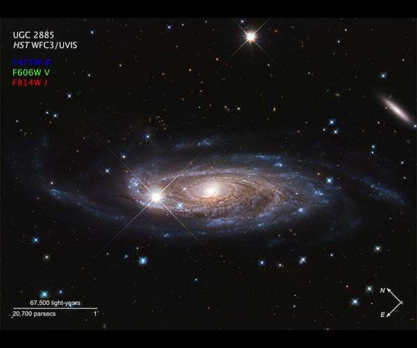 This majestic spiral galaxy might earn the nickname the "Godzilla Galaxy" because it may be the largest known in the local universe. The galaxy, UGC 2885, is 2.5 times wider than our Milky Way and contains 10 times as many stars. But it is a "gentle giant," say researchers, because it looks like it has been sitting quietly over billions of years, possibly sipping hydrogen from the filamentary structure of intergalactic space. This fuels modest ongoing star birth at half the rate of our Milky Way. In fact, its supermassive central black hole is a sleeping giant, too; because the galaxy does not appear to be feeding on much smaller satellite galaxies, it is starved of infalling gas. The galaxy has been nicknamed "Rubin's galaxy," after astronomer Vera Rubin (1928-2016) by Benne Holwerda of the University of Louisville, Kentucky, who observed the galaxy with NASA's Hubble Space Telescope. "My research was in a large part inspired by Vera Rubin's work in 1980 on the size of this galaxy." Rubin measured the galaxy's rotation, which provides evidence for dark matter, which makes up most of the galaxy's mass as measured by the rotation rate. "We consider this a commemorative image. This goal to cite Dr. Rubin in our observation was very much part of our original Hubble proposal." In results being presented at the winter American Astronomical Society meeting in Honolulu, Hawaii, Holwerda is seeking to understand what led to the galaxy's monstrous size. "How it got so big is something we don't quite know yet," said Holwerda. "It's as big as you can make a disk galaxy without hitting anything else in space." One clue is that the galaxy is fairly isolated in space and doesn't have any nearby galaxies to crash into and disrupt the shape of its disk. Did the monster galaxy gobble up much smaller satellite galaxies over time? Or did it just slowly accrete gas for new stars? "It seems like it's been puttering along, slowly growing," Holwerda said. Using Hubble's exceptional resolution, his team is counting the number of globular star clusters in the galaxy's halo - a vast shell of faint stars surrounding the galaxy. An excess of clusters would yield evidence that they were captured from smaller infalling galaxies over many billions of years. NASA's upcoming James Webb Space Telescope could be used to explore the center of this galaxy as well as the globular cluster population. NASA's planned Wide Field Infrared Survey Telescope (WFIRST) would give an even more complete census of this galaxy's cluster population, especially that of the whole halo. "The infrared capability of both space telescopes would give us a more unimpeded view of the underlying stellar populations," said Holwerda. This complements Hubble's visible-light ability to track wispy star formation throughout the galaxy. A number of foreground stars in our Milky Way can be seen in the image, identified by their diffraction spikes. The brightest appears to sit on top of the galaxy's disk, though UGC 2885 is really 232 million light-years farther away. The giant galaxy is located in the northern constellation Perseus.