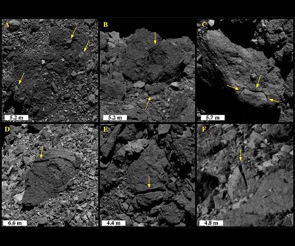 Asteroids don't just sit there doing nothing as they orbit the Sun. They get bombarded by meteoroids, blasted by space radiation, and now, for the first time, scientists are seeing evidence that even a little sunshine can wear them down. Rocks on asteroid Bennu appear to be cracking as sunlight heats them up during the day and they cool down at night, according to images from NASA's OSIRIS-REx (Origins Spectral Interpretation Resource Identification Security - Regolith Explorer) spacecraft. "This is the first time evidence for this process, called thermal fracturing, has been definitively observed on an object without an atmosphere," said Jamie Molaro of the Planetary Science Institute, Tucson, Arizona, lead author of a paper appearing in Nature Communications June 9. "It is one piece of a puzzle that tells us what the surface used to be like, and what it will be like millions of years from now." "Like any weathering process, thermal fracturing causes the evolution of boulders and planetary surfaces over time - from changing the shape and size of individual boulders, to producing pebbles or fine-grained regolith, to breaking down crater walls," said OSIRIS-REx principal investigator Dante Lauretta of the University of Arizona, Tucson. "How quickly this occurs relative to other weathering processes tells us how and how quickly the surface has changed." Rocks expand when sunlight heats them during the day and contract as they cool down at night, causing stress that forms cracks that grow slowly over time. Scientists have thought for a while that thermal fracturing could be an important weathering process on airless objects like asteroids because many experience extreme temperature differences between day and night, compounding the stress. For example, daytime highs on Bennu can reach almost 127 degrees Celsius or about 260 degrees Fahrenheit, and nighttime lows plummet to about minus 73 degrees Celsius or nearly minus 100 degrees Fahrenheit. However, many of the telltale features of thermal fracturing are small, and before OSIRIS-REx got close to Bennu, the high-resolution imagery required to confirm thermal fracturing on asteroids didn't exist. The mission team found features consistent with thermal fracturing using the spacecraft's OSIRIS-REx Camera Suite (OCAMS), which can see features on Bennu smaller than one centimeter (almost 0.4 inches). It found evidence of exfoliation, where thermal fracturing likely caused small, thin layers (1 - 10 centimeters) to flake off of boulder surfaces. The spacecraft also produced images of cracks running through boulders in a north-south direction, along the line of stress that would be produced by thermal fracturing on Bennu. Other weathering processes can produce similar features, but the team's analysis ruled them out. For example, rain and chemical activity can produce exfoliation, but Bennu has no atmosphere to produce rain. Rocks squeezed by tectonic activity can also exfoliate, but Bennu is too small for such activity. Meteoroid impacts do occur on Bennu and can certainly crack rocks, but they would not cause the even erosion of layers from boulder surfaces that were seen. Also, there's no sign of impact craters where the exfoliation is occurring. Additional studies of Bennu could help determine how rapidly thermal fracturing is wearing down the asteroid, and how it compares to other weathering processes. "We don't have good constraints yet on breakdown rates from thermal fracturing, but we can get them now that we can actually observe it for the first time in situ," said OSIRIS-REx project scientist Jason Dworkin of NASA's Goddard Space Flight Center in Greenbelt, Maryland. "Laboratory measurements on the properties of the samples returned by the spacecraft in 2023 will help us learn more about how this process works." Another area of research is how thermal fracturing affects our ability to estimate the age of surfaces. In general, the more weathered a surface is, the older it is. For example, a region with a lot of craters is likely to be older than an area with few craters, assuming impacts happen at a relatively constant rate across an object. However, additional weathering from thermal fracturing could complicate an age estimate, because thermal fracturing is going to happen at a different rate on different bodies, depending on things like their distance from the Sun, the length of their day, and the composition, structure and strength of their rocks. On bodies where thermal fracturing is efficient, then it may cause crater walls to break down and erode faster. This would make the surface look older according the cratering record, when in fact it is actually younger. Or the opposite could occur. More research on thermal fracturing on different bodies is needed to start to get a handle on this, according to Molaro.