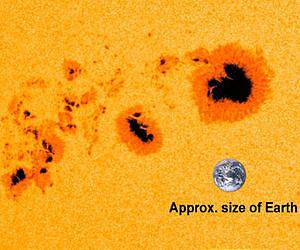 An enormous sunspot, labeled AR1944, slipped into view over the sun's left horizon late on Jan. 1, 2014. The sunspot steadily moved toward the right, along with the rotation of the sun, and now sits almost dead center, as seen in the image above from NASA's Solar Dynamics Observatory. Sunspots are dark areas on the sun's surface that contain complex arrangements of strong magnetic fields that are constantly shifting. The largest dark spot in this configuration is approximately two Earths wide, and the entire sunspot group is some seven Earths across. For comparison, another giant sunspot, five to six Earths across, is shown below from 2005. The image was captured by the European Space Agency and NASA's Solar and Heliospheric Observatory. Sunspots are part of what's known as active regions, which also include regions of the sun's atmosphere, the corona, hovering above the sunspots. Active regions can be the source of some of the sun's great explosions: solar flares that send out giant bursts of light and radiation due to the release of magnetic energy, or coronal mass ejections that send huge clouds of solar material out into space. As the sunspot group continues its journey across the face of the sun, scientists will watch how it changes and evolves to learn more about how these convoluted magnetic fields can cause space weather events that can affect space-borne systems and technological infrastructure on Earth.