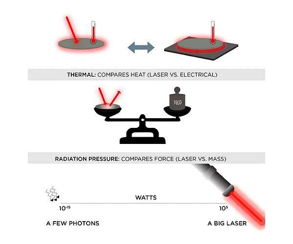 Always on the lookout for better ways to measure all kinds of things, researchers at the National Institute of Standards and Technology (NIST) have published a detailed study suggesting an "elegant" improved definition for the standard unit of light power, the optical watt. But it's more than just an opportunity to nerd out over an international measurement unit. The proposed definition promises a more precise, less expensive and more portable method for measuring this important quantity for science, technology, manufacturing, commerce and national defense. Instead of the current definition based on comparisons to electrical heating, the NIST study suggests the optical watt could be determined from light's radiation force and its speed, a fundamental constant. Fundamental constants are numbers that stay the same all over the world, making measurements based on them universal. Primary standards that define measurement units based on fundamental constants are considered ideal. "Johannes Kepler made the first observations of radiation pressure in the early 17th century," NIST project leader John Lehman said. "A few years ago, we decided to create a primary measurement standard on this basis." Maybe someday we will all redefine optical power this way." The proposed definition is based on James Clerk Maxwell's work in 1862 showing that the force exerted by light is proportional to its power divided by the speed of light. Now, practical measurement standards can be created on this basis thanks to recent NIST technical advances. The NIST proposal is in sync with the recent redefinition of the International Systems of Units (SI), offering more reliable measurements based on unchanging properties of nature. The watt is the SI unit of power, which, as Maxwell found, can be used to calculate force, or vice versa. The NIST suggestion might also help resolve debates over how best to define a related optical quantity known as luminous intensity. This quantity is expressed in terms of the SI base unit known as the candela, which depends in part on the properties of human vision. The new study was done in the context of NIST's laser power measurement and calibration services, first offered in 1974. In recent years NIST researchers have expanded the range of light power that can be measured, from very low light intensity of a few photons (light particles) per second to 100-kilowatt lasers emitting 100,000,000,000,000,000,000,000 photons per second. To measure optical power the conventional way, researchers aim a laser at a coated detector, measure the detector's temperature change, and then determine the electrical power needed to generate an equivalent amount of heat. As is required for measurement standards, this method can be traced to the SI, but indirectly through the volt and the ohm, which in turn are "derived units" based on nist-equations using multiple SI units. NIST's equipment for measuring the optical watt this way is large and not portable. In the newer approach, laser power can be measured by comparing it to the force of gravity on a reference mass (typically weighed on an "analytical balance" or scale) or an equivalent force. NIST has recently developed a technique that measures a laser's force, or the push exerted on a mirror by a stream of photons. The result, measured in either milligrams (mass) or micronewtons (force), is traceable to the SI base unit the kilogram and can be used to calculate optical power. The approach is especially helpful for high-power lasers used in manufacturing and the military because it is simpler, faster, less costly and more portable than conventional methods. The new NIST study established the validity of the mass/force approach by finding strong agreement between its results and those of the conventional method. But the NIST proposal also offers several significant advantages: a portable primary standard in the form of a reference mass, and the potential for improved precision. Calculations of mass require knowledge of the exact amount that gravity accelerates objects at a particular altitude and location. Force calculations do not, making it simpler as a primary standard.