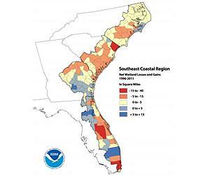 Selected Regional Findings - 1996 to 2011 + The West Coast region experienced a net loss of 3,200 square miles of forest (4,900 square miles of forests were cut while 1,700 square miles were regrown) + The Great Lakes was the only region to experience a net wetlands gain (69 square miles), chiefly because drought and lower lake levels changed water features into marsh or sandy beach. + The Southeast region lost 510 square miles of wetlands, with more than half this number replaced by development + Many factors led to the Gulf Coast region's loss of 996 square miles of wetlands, due to land subsidence and erosion, storms, man-made changes, sea level rise, and other factors + On a positive note, local restoration activities, such as in Florida's Everglades, and lake-level changes enabled some Gulf Coast and Southeast region communities to gain modest-sized wetland areas, although such gains did not make up for the larger regional wetland losses + C-CAP moderate-resolution data on the Land Cover Atlas encompasses the intertidal areas, wetlands, and adjacent uplands of 29 states fronting the oceans and Great Lakes. High-resolution data are available for select locations. All C-CAP data sets are featured on the Digital Coast. Tools like the Digital Coast are important components of NOAA's National Ocean Service's efforts to protect coastal resources and keep communities safe from coastal hazards by providing data, tools, training, and technical assistance. Check out other products and services on Facebook or Twitter. NOAA's mission is to understand and predict changes in the Earth's environment, from the depths of the ocean to the surface of the sun, and to conserve and manage our coastal and marine resources. Join us on Twitter, Facebook and our other social media channels. Visit our news release archive.