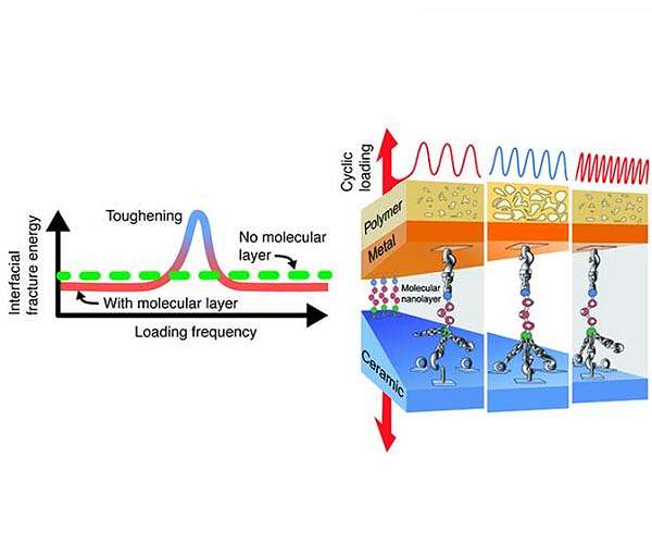 In a discovery that could pave the way for new materials and applications, materials scientists at Rensselaer Polytechnic Institute have found that oscillating loads at certain frequencies can lead to several-fold increases in the strength of composites with an interface that is modified by a molecular layer of "nanoglue." A newly published article in Nature Communications reports the unexpected discovery of the effects of loading frequency on the fracture energy of a multilayer composite involving a "nanoglue," the use of which was also pioneered at Rensselaer. Composites engineered at the nanometer-scale are of interest in a variety of applications including energy, electronics, and biomedicine. The performance and reliability of such composites are often governed by the integrity of interfaces between dissimilar materials during loading fluctuations triggered by thermal, electrical and mechanical stimuli. "Unearthing, understanding, and manipulating nanoscale phenomena at interfaces during dynamic stimuli is a key to designing new materials with novel responses for applications," said Ganpati Ramanath, the John Tod Horton Professor of Materials Science and Engineering at Rensselaer and the lead author on the study. "Our work demonstrates that introducing a nanoglue layer at an interface of a layered composite can lead to large mechanical toughening at certain loading frequencies." Ramanath and his team of collaborators found that, at certain loading frequencies, the energy required to fracture a nanoglue-modified polymer-metal-ceramic composite tripled, and exceeded the static loading fracture energy. This behavior is unexpected and significant because fracture energy is typically lower during cyclic loading than it is during static loading. Such frequency-dependent toughening was observed only when a nanoglue layer was used to bond the metal and the ceramic. The results also show that while the nanolayer is necessary for toughening to occur, the frequency range and the extent of toughening are primarily determined by the mechanical properties of the polymer in the composite. Specifically, the nanoglue facilitates load transfer across the metal-ceramic interface and dissipates energy in the polymer through plastic deformation, leading to an increase in fracture energy. "Our discovery opens up an entirely new set of possibilities to design composites with novel responses using different combinations of polymers and interfacial nanolayers. For example, we could realize a completely new class of smart composites that can significantly toughen, or perhaps even self-destruct, at certain frequencies," Ramanath said. "Our findings of beneficiary couplings between the nanoglue effect and the properties of a constituent in a composite during cyclic loading opens a new paradigm in reliability engineering," said co-author Michael Lane, the Billie Sue Hurst Professor of Chemistry at Emory and Henry College. "Manipulating the coupling can actually make composites more robust under just the loading conditions we have traditionally tried to avoid, and hence, can vastly expand the scope and improve the performance of composites in applications." This groundbreaking work is the product of a collaboration between researchers from multiple disciplines who are based in New York, Virginia, and Grenoble, France. As such, it is illustrative of the international and interdisciplinary nature of The New Polytechnic, the guiding model for research and education at Rensselaer.